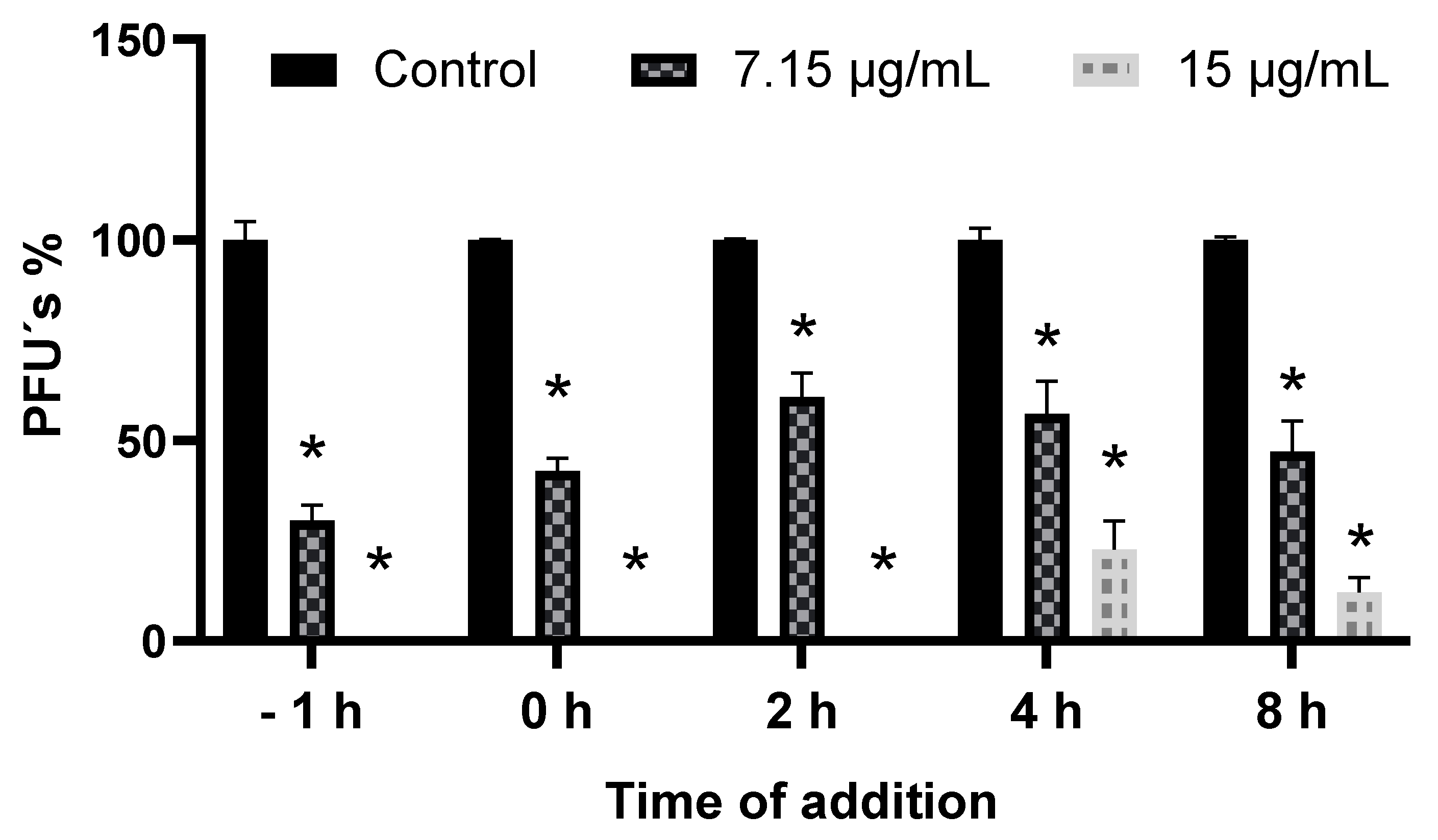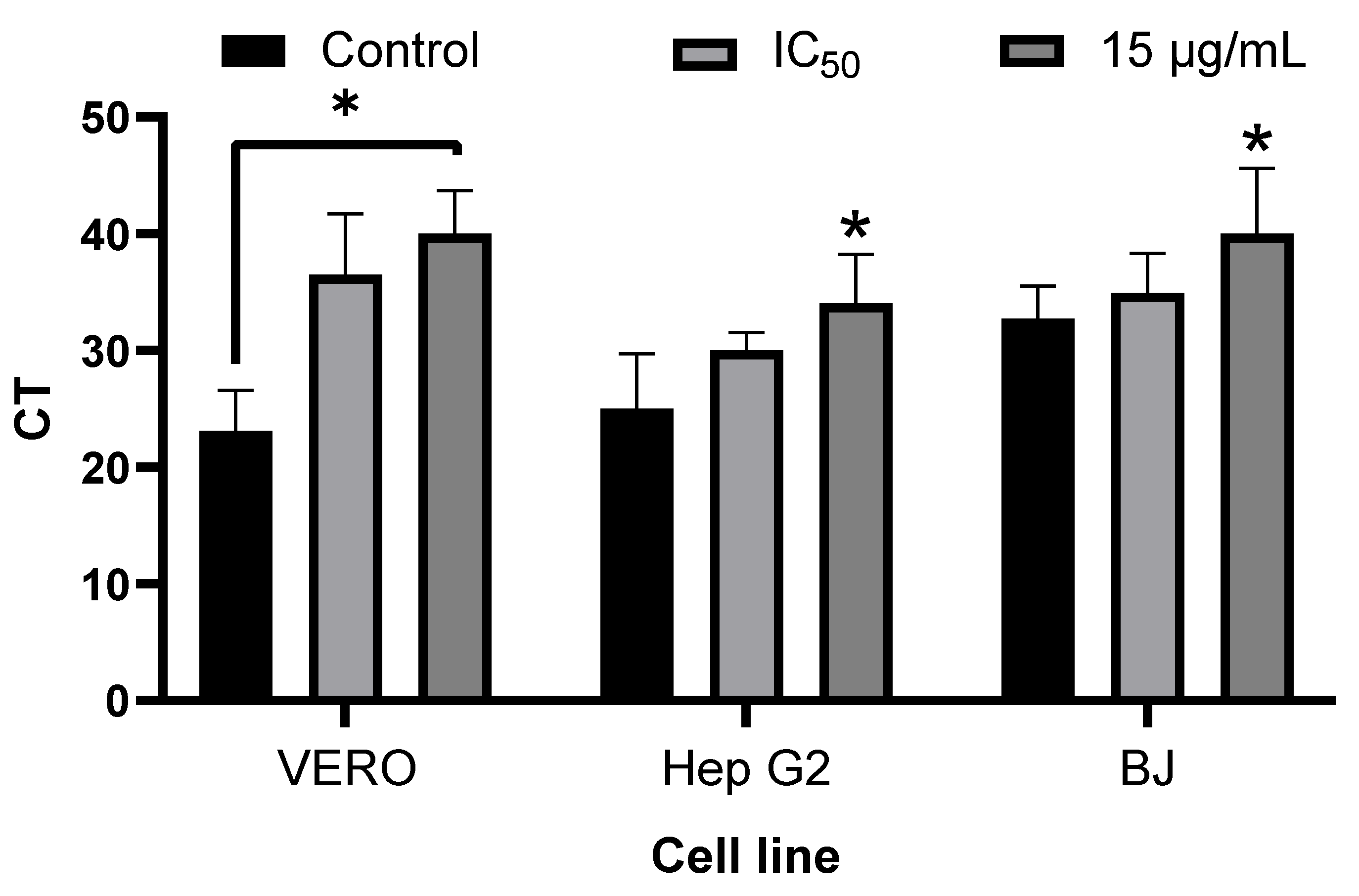 3.6. Inhibition of Viral Replication by Quantitative Reverse Transcription Polymerase Chain Reaction (qRT-PCR)