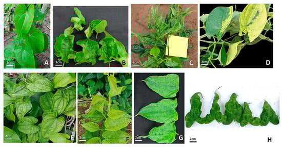 Symptoms of yam viral diseases observed in yam fields in Côte d’Ivoire: (A): healthy, (B): distortions, (C): shoe-string and stunting, (D): bleaching, (E): mottling and vein banding, (F): chlorotic mottle, (G): mosaic, (H): puckering. Dioscorea alata (C,E–H); Dioscorea cayenensis-rotundata (A,B,D).