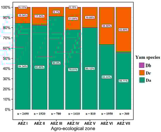 Repartition of Dioscorea alata, Dioscorea cayenensis-rotundata, and Dioscorea bulbifera fields assessed according to the Agro-ecological zones. Legend: Da: Dioscorea alata, Dr: Dioscorea cayenensis-rotundata, and Db: Dioscorea bulbifera.