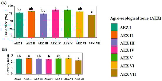 Epidemiological assessment of viral disease symptoms in yam fields surveyed in Côte d’Ivoire: (A) incidence of yam viral symptoms; (B) mean symptoms severity. Statistical significance was calculated using the LSD test at a 0.5 threshold (α = 0.05); the same letters are not significantly different between agro-ecological zones (AEZs).