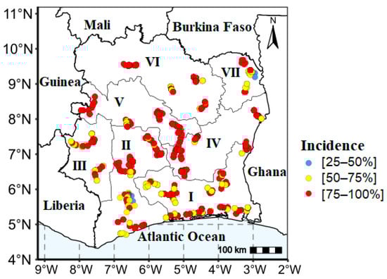 The result shows the presence of yam viral disease symptoms in all agro-ecological zones of the country (Figure 5). High incidences (75–100%) were primarily widespread in the central and western regions of the country, while the southern region predominantly exhibited moderate incidences ranging from 25 to 75%.