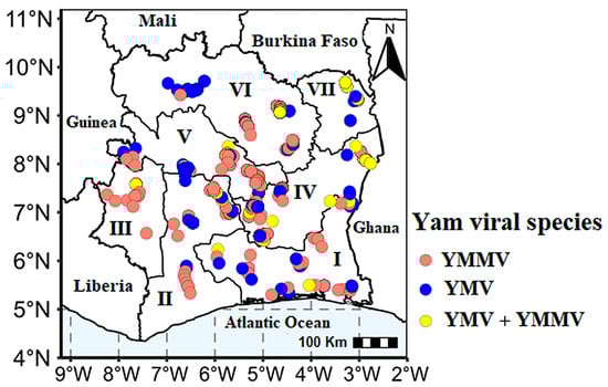 Yam diseases caused by viral pathogens are among the most important, as they are known to reduce tuber yields by up to 40% [14,15]. Yam viruses cause an uneven loss of photosynthetic activity and often higher rates of chloroplast senescence, reducing sugar production and starch storage. As a result, tuber yield and quality are significantly reduced [16], and the exchange of planting material between farmers and across countries is a major means of virus propagation. YMV is the most widespread and damaging virus, especially in West Africa, the Caribbean, and the West Indies [14,17], while YMMV is the second most common yam virus, particularly in D. alata, often co-occurring with YMV [18]. DBVs are globally distributed and frequently symptomless, complicating detection and control [7]. The term DBV refers to Dioscorea bacilliform viruses, a diverse group of badnaviruses infecting yams (Dioscorea spp.), and the members possess circular double-stranded DNA genomes. At least 15 groups of DBVs have been identified. Further, the genome of the African yam, Dioscorea cayenensis-rotundata, has been demonstrated to host endogenous DBV sequences (eDBVs) originating from integrated badnavirus DNA in four distinct badnavirus groups (K5, K8, K9, and U12). Eight episomal DBV species have been identified in yams, and some species are still unknown [1,8]. Meanwhile, CMV, though less prevalent, is increasingly reported in mixed infections, adding to the overall disease burden on yam crops [19]. Yam mosaic virus was first described in Côte d’Ivoire by Thouvenel and Fauquet in 1977 [20]. Seka et al. [11] reported YMV and CMV in Bouaké and Toumodi, two yam-growing localities of Côte d’Ivoire. Bouaké and Toumodi had average YMV and CMV incidences of 88% and 95% and 10.85% and 16.28%, respectively, with mixed virus infections in 4.10% of the samples. Also, Toualy et al. [12] assessed 79 fields in the main yam-growing areas in Cte d’Ivoire and reported the presence of YMV, CMV, and yam-infecting badnaviruses, respectively, in 36%, 1.5%, and 39.1% of the samples tested. In addition to these three viruses, Bakayoko et al. [13] also detected potexvirus (family Alphaflexiviridae) and Dioscorea mosaic-associated virus (DMaV, family Secoviridae) in the national agricultural research centre (Centre National de Recherche Agronomique, CNRA)’s yam accessions collection. The DMaV genome is composed of two positive-sense RNA molecules and is from the genus Sadwavirus of the family Secoviridae. Effective management of yam viral diseases in Côte d’Ivoire requires updated information on the incidence, severity, diversity, and distribution of various virus species across all the agro-ecological zones, as well as their association with cultivated yam species. Such data are essential for developing effective control strategies. Therefore, this study aims to fill this knowledge gap by providing a comprehensive epidemiological assessment of yam viruses in the country.