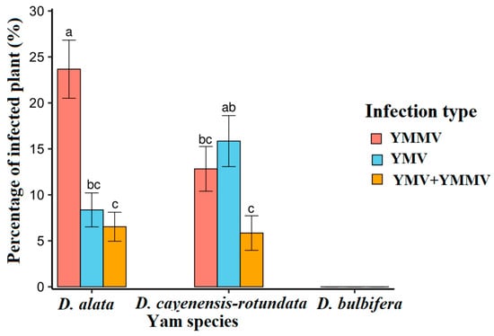 Proportion of infected plants according to the virus in each yam species. Statistical significance was calculated using the LSD test at a 0.5 threshold (α = 0.05). Percentages followed by the same letters are not significantly different.