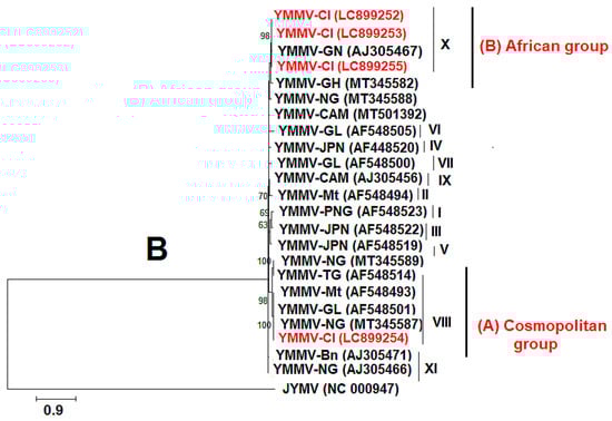 Maximum-likelihood phylogenetic tree indicating the relationships of partial yam mosaic virus (YMV) and yam mild mosaic virus (YMMV) nucleotide sequences from this study and diverse representative isolates of the three viruses. (A) The tree is based on the coat protein (CP) of yam mosaic virus and rooted using Japanese yam mosaic virus (GenBank accession NC 000947) as an outgroup. The different groups are made following the classification of Bousalem et al. [34]. (B) The tree is based on the coat protein (CP) of yam mild mosaic virus and rooted using Japanese yam mosaic virus (GenBank accession NC 000947) as an outgroup. The groups are formed following the classification of Bousalem et al. [35] and Nkere et al. [18]. The sequences from GenBank are coloured black, and the sequences from this study are in red. Bootstrap analysis was performed with 1000 replicates, and the horizontal scale indicates the genetic distance.