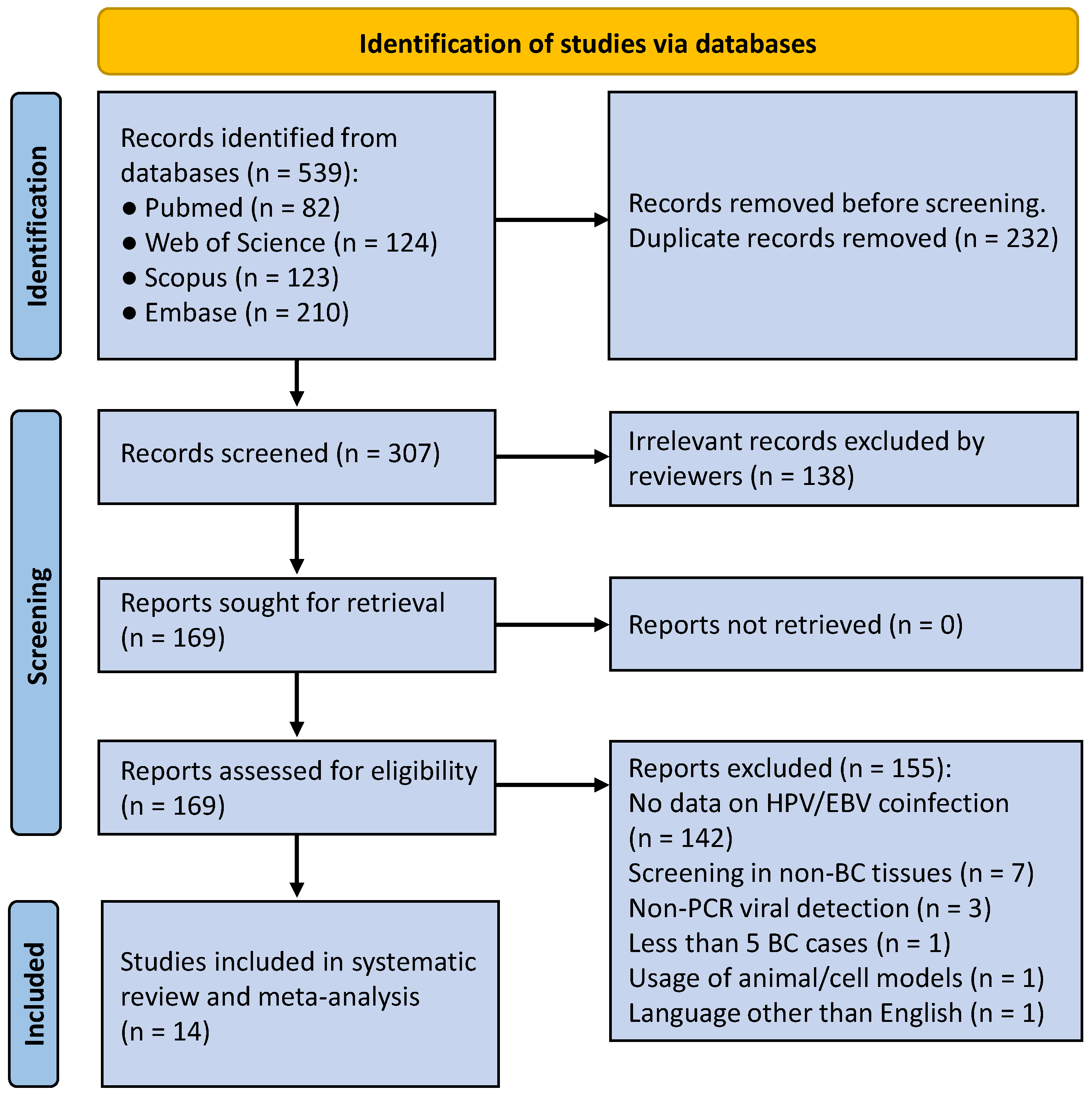 - (‘Breast Neoplasm’ OR ‘Breast Tumors’ OR ‘Breast Tumor’ OR ‘Breast Neoplasms’ OR ‘Breast Cancer’ OR ‘Mammary Cancer’ OR ‘Mammary Cancers’ OR ‘Breast Malignant Neoplasm’ OR ‘Breast Malignant Neoplasms’ OR ‘Breast Malignant Tumor’ OR ‘Breast Malignant Tumors’ OR ‘Human Mammary Carcinomas’ OR ‘Human Mammary Carcinoma’ OR ‘Human Mammary Neoplasm’ OR ‘Human Mammary Neoplasms’ OR ‘Breast Carcinoma’ OR ‘Breast Carcinomas’) AND (‘Epstein-Barr Virus’ OR ‘Epstein Barr Virus’ OR ‘Burkitt Lymphoma Virus’ OR ‘Burkitts Lymphoma Virus’ OR ‘E-B Virus’ OR ‘Infectious Mononucleosis Virus’ OR ‘Infectious Mononucleosis Viruses’ OR ‘HHV-4′ OR ‘HHV4′ OR ‘Human Herpesvirus 4′ OR ‘Burkitt Herpesvirus’ OR ‘EBV’) AND (‘Human Papillomavirus’ OR ‘HPV Human Papillomavirus’ OR ‘Human Papilloma Virus’ or ‘HPV’)