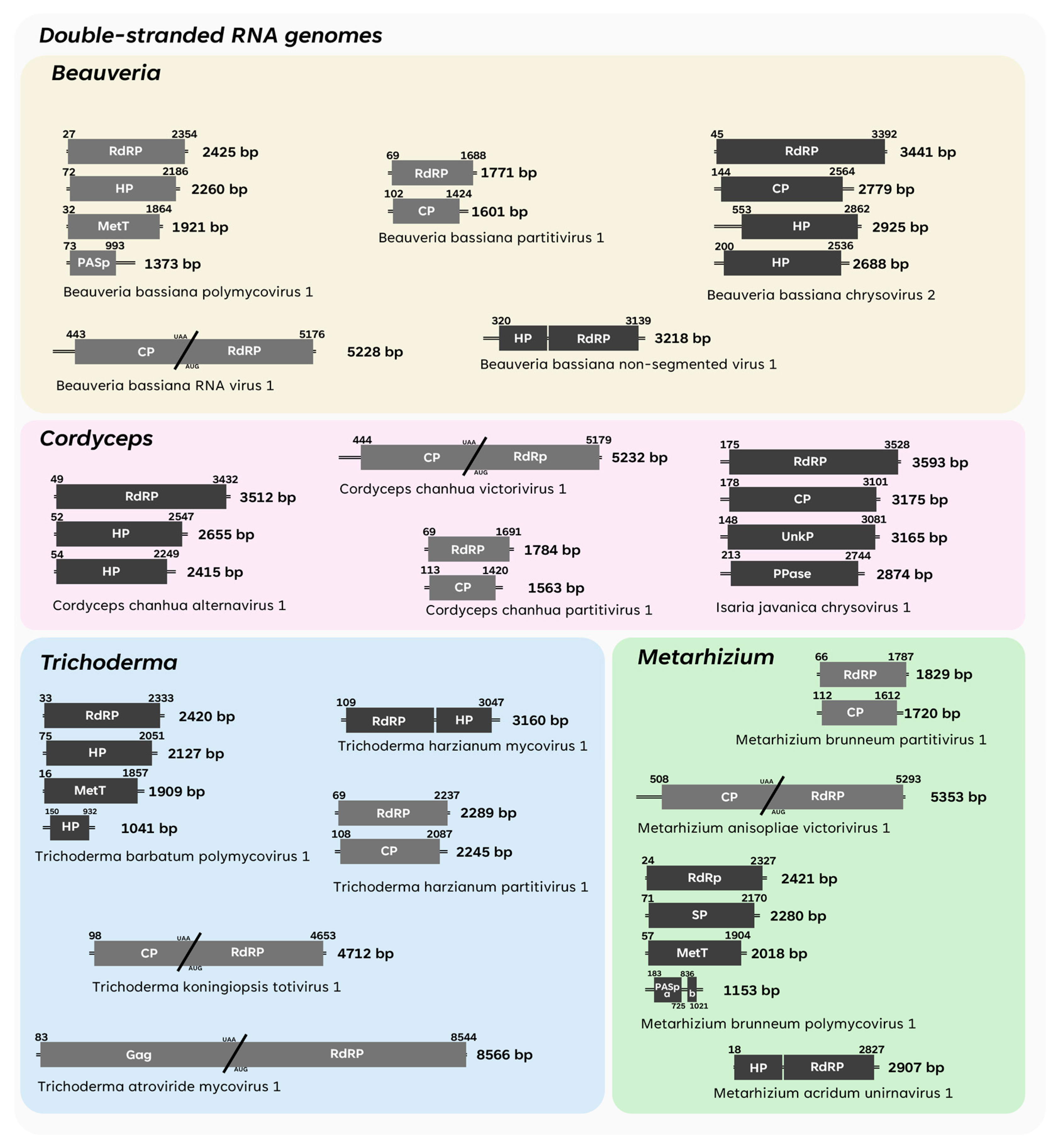 - Wang, P.; Yang, G.; Shi, N.; Huang, B. Molecular Characterization of a Novel Double-Stranded RNA Virus Infecting the Entomopathogenic Fungus Metarhizium brunneum. Arch. Microbiol. 2022, 204, 606. [Google Scholar] [CrossRef]