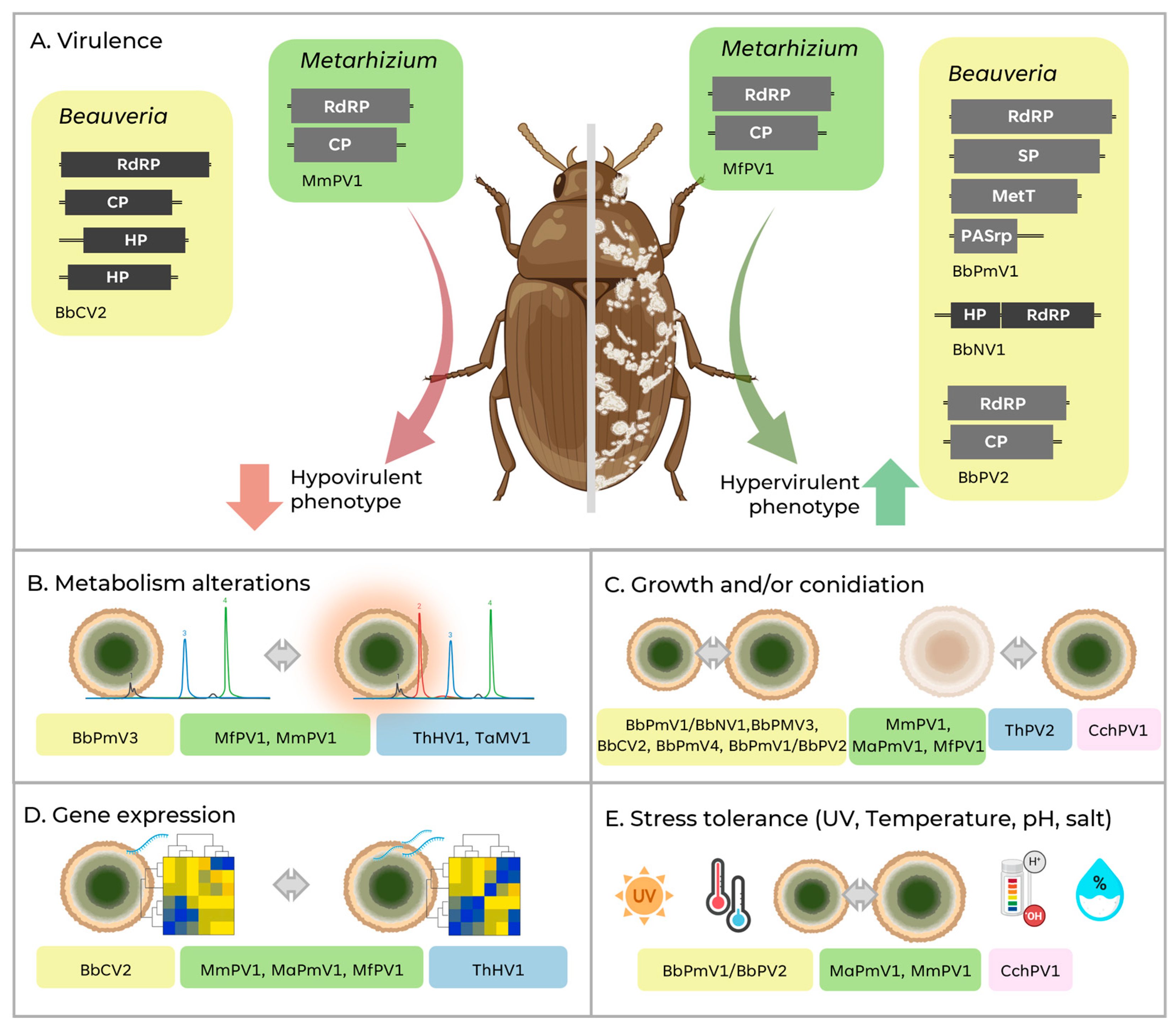 - Rueda-Maíllo, F.; Garrido-Jurado, I.; Kotta-Loizou, I.; Quesada-Moraga, E. A Mycoviral Infection Drives Virulence and Ecological Fitness of the Entomopathogenic Fungus Beauveria bassiana. J. Invertebr. Pathol. 2025, 209, 108251. [Google Scholar] [CrossRef]