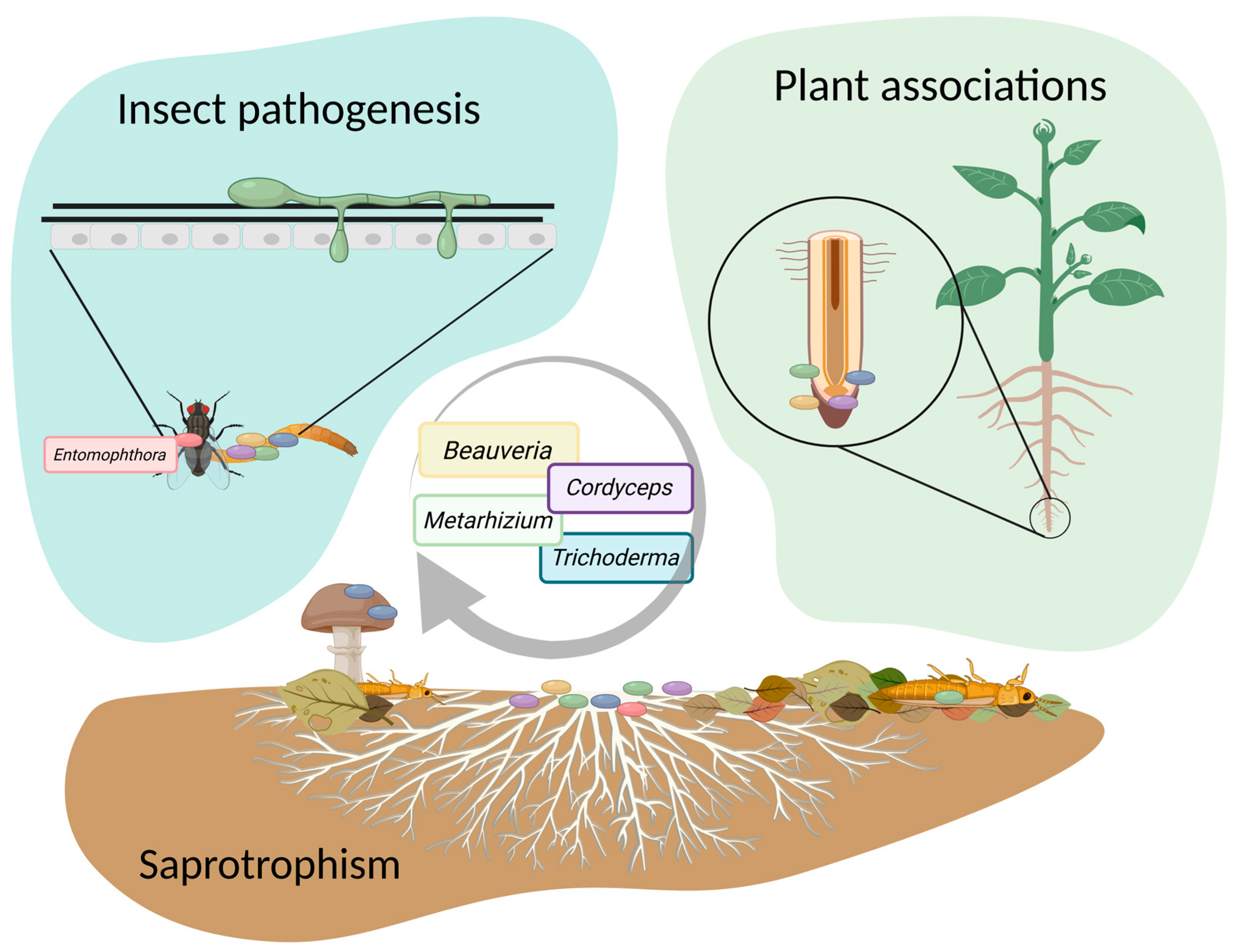 - Boomsma, J.J.; Jensen, A.B.; Meyling, N.V.; Eilenberg, J. Evolutionary Interaction Networks of Insect Pathogenic Fungi. Annu. Rev. Entomol. 2014, 59, 467–485. [Google Scholar] [CrossRef]