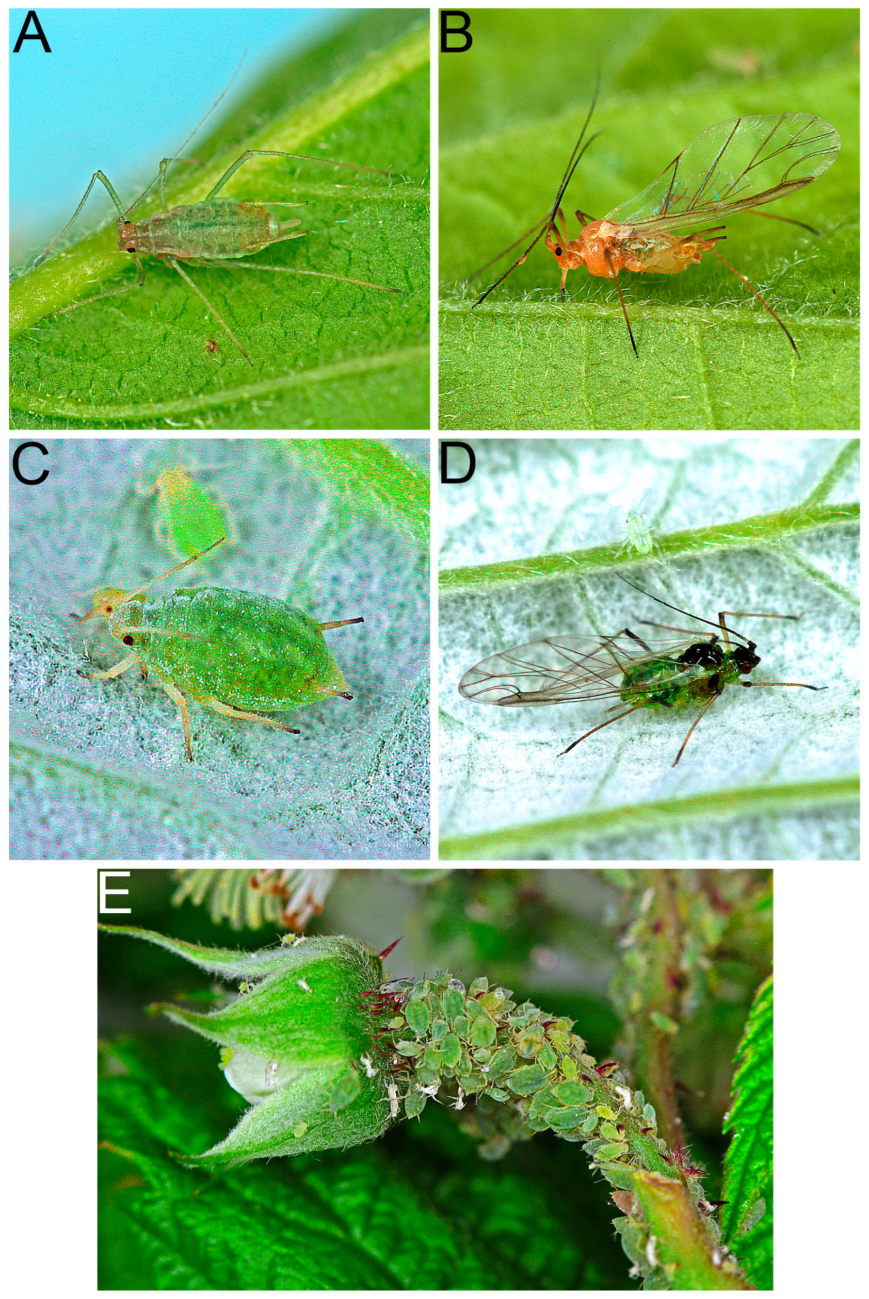 - Sapkota, B.; Trandem, N.; Fránová, J.; Koloniuk, I.; Blystad, D.-R.; Hamborg, Z. Incidence of aphid-transmitted viruses in raspberry and raspberry aphids in Norway and experiments on aphid transmission of black raspberry necrosis virus. Front. Plant Sci. 2024, 15, 1441145. [Google Scholar] [CrossRef]