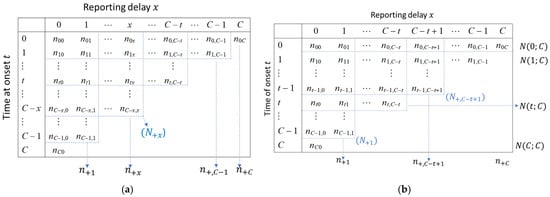 Upper triangular matrix depicting reporting delays. Panel (a) describes the matrix with time of onset on the y-axis and reporting delay on the x-axis and column totals. Panel (b) describes the matrix with time of onset on the y-axis and reporting delay on the x-axis with row and column totals.