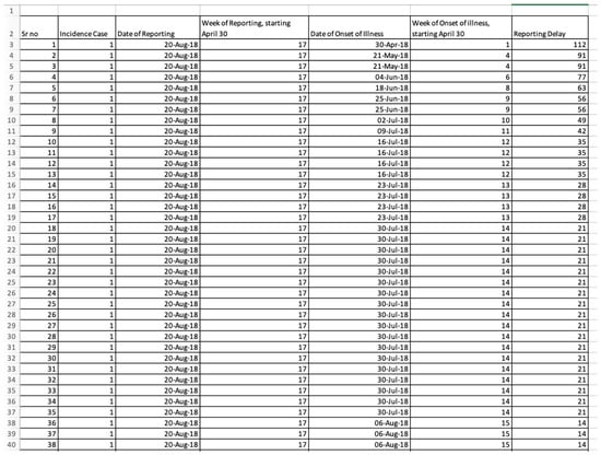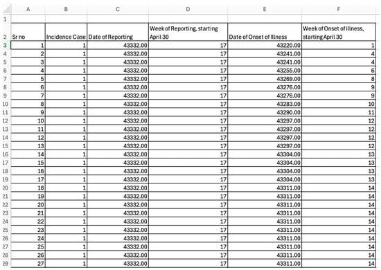Snapshot of the Excel data file with dates converted to number format, created from the WHO situation report published on 3 March 2019.