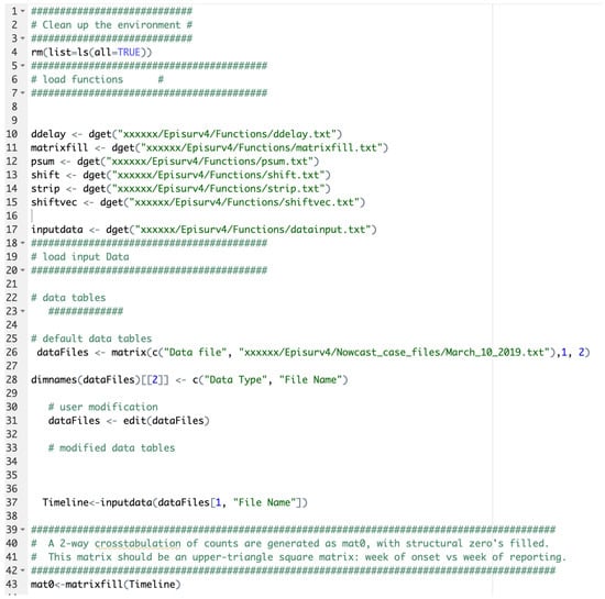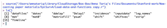 The load-data-and-functions.R file is an R-Studio program that allows users to load all functions into the algorithm (Figure 5). This file contains the algorithm to produce a two-way crosstabulation of case/death counts that are generated as “mat0”, as structural zeros fill in the matrix. This matrix is a square upper-right triangle matrix representing the week of onset versus the week of reporting. The algorithm also produces an upper-left triangular square matrix, “mat”, representing the week of onset versus the week of reporting. This matrix is utilized in the “ddelay” function.