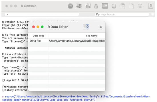 Dialog box as seen using the code Source (“c:/EpiSurv/load-data-and-functions.r”) in R console.