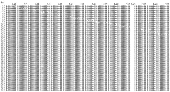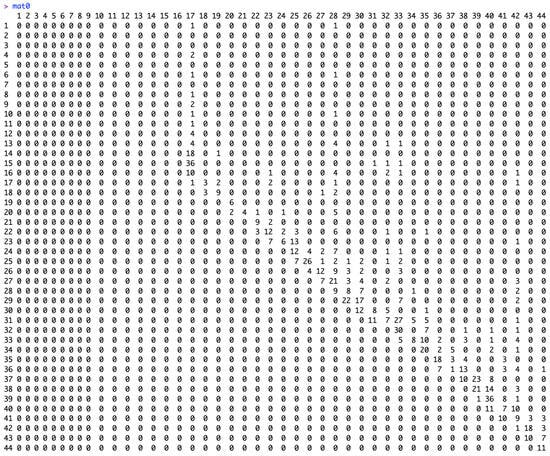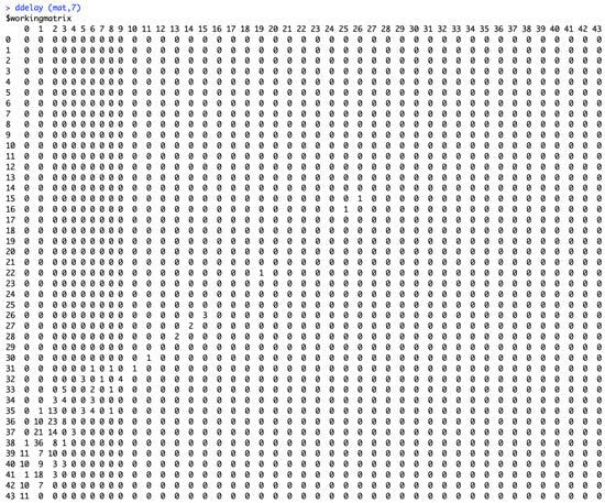 To check the components of the right and left upper triangular matrices, we provide the command “mat” and “mat0”. The matrix “mat” is an upper-left triangular square matrix with rows representing the week of onset and columns representing the reporting delay (Figure 8). The matrix “mat0” is an upper-right triangular square matrix with rows representing the week of onset and columns representing the week of reporting (Figure 9).