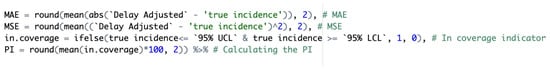 In this tutorial example, the performance metrics are estimated against the true incidence reported eight weeks later () for the same dates of onset. True incidence varies for different epidemics (two weeks later, eight weeks later, four months later, etc) and needs to be identified based on the reporting practices and the time when the case counts have become complete. All performance metrics for the nowcasting approach are computed in R-Studio Version 2023.06.1+524.