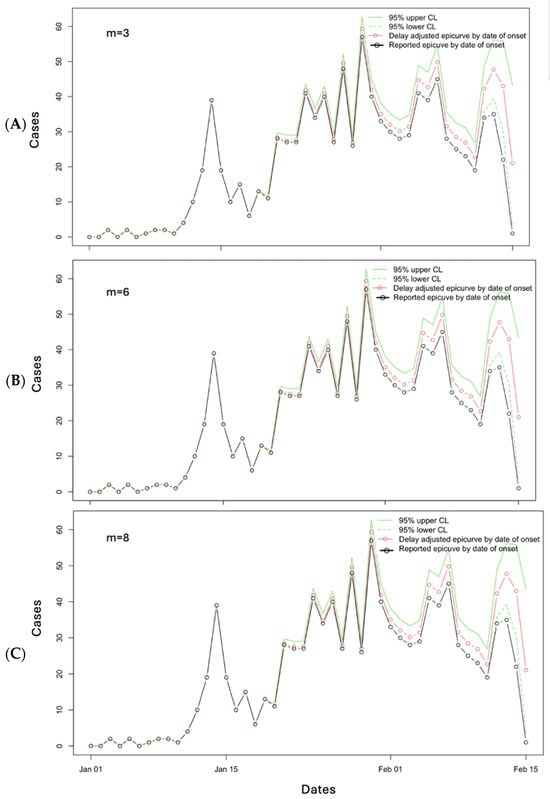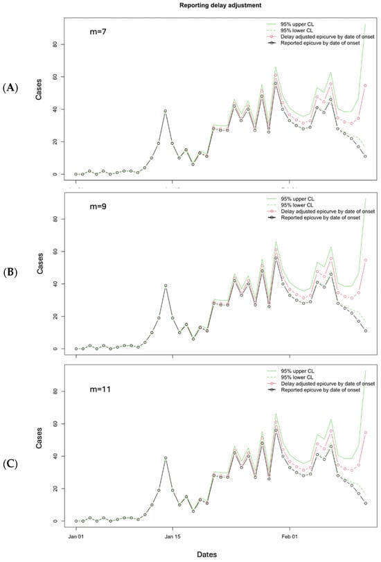 Based on the results of the performance metrics, the best “m” value would be m = 7 for 3 March 2019, assuming a non-stationary reporting delay pattern of seven weeks. Below, we show the panel figure representing the reporting delay-adjusted incidence curve using different values of “m” for the 3 March 2019 data file (Figure 16).