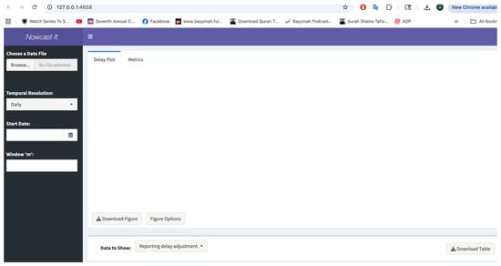 A screenshot of the Nowcast-It R-Shiny App (v1.0.0; R 4.3; R-Studio 2024.09.0+375) user interface. This figure provides a snapshot of the user interface for obtaining the reporting delay adjustment curves and other associated data files. As can be seen, the user has options to choose a data file, and then must specify information related to the temporal resolution of the data and the length of the reporting delay window, m.
