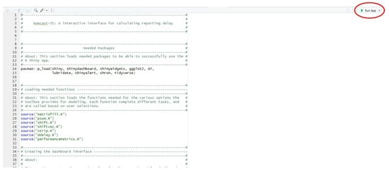 Prior to launching the R-Shiny application, the user first must load the R Project file located within the downloaded GitHub repository. Launching the R Project prior to running the R-Shiny ensures that the working directory is properly set up on the user’s local machine, and all functions and folders are correctly referenced. Once loaded, the users can then open the ‘app.R’ file via the panel in the bottom-right portion of the R screen. Finally, the user should hit the ‘Run App’ button on the top-right corner to launch the Nowcast-It application on their local machine (Figure 20).