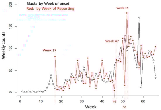 Depiction of the long reporting delays as reported in the situation report published on 9 August 2019. The black line with open circles indicates the incidence curve by week of onset and the red line with filled circles is the incidence curve by the week of reporting.