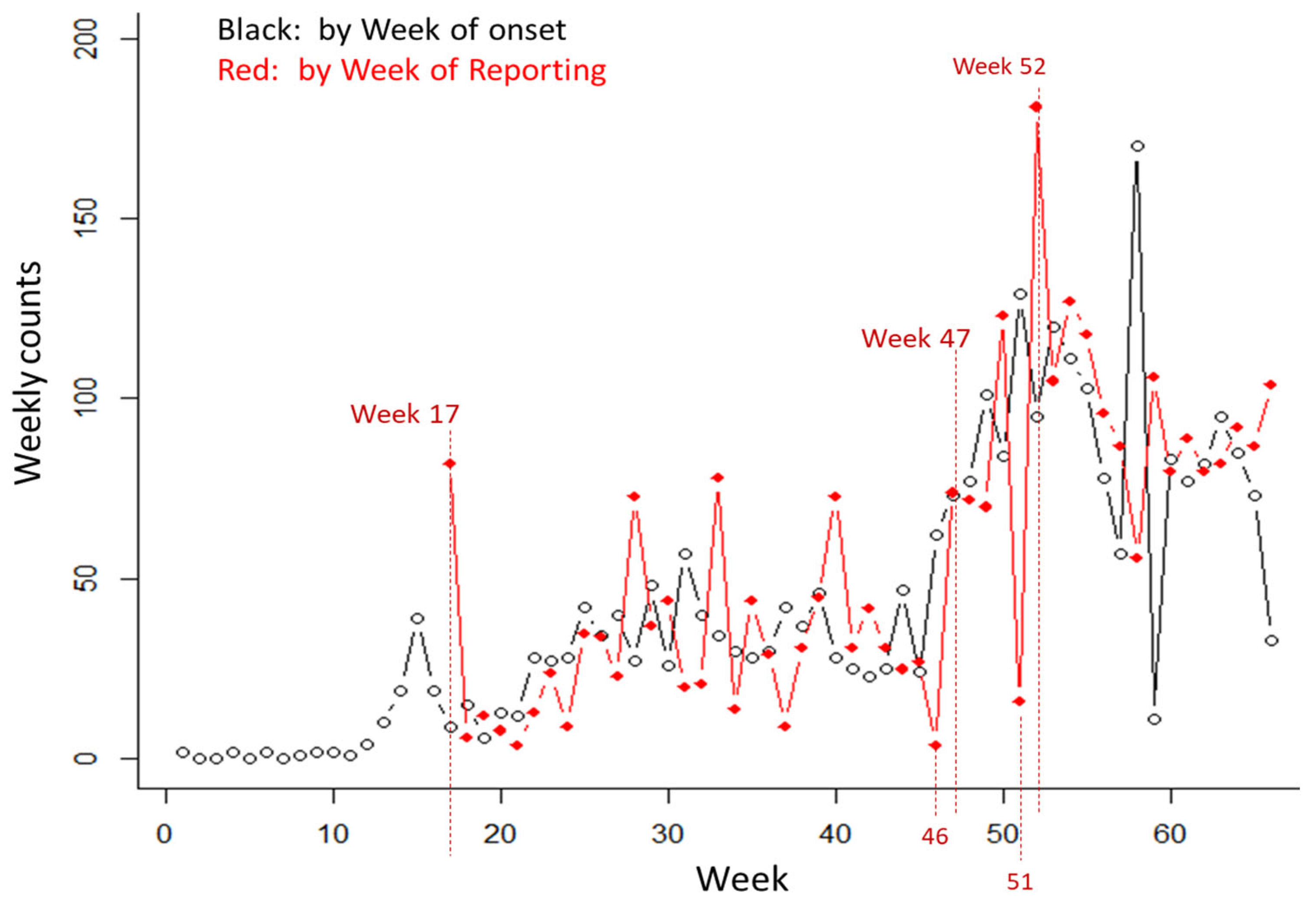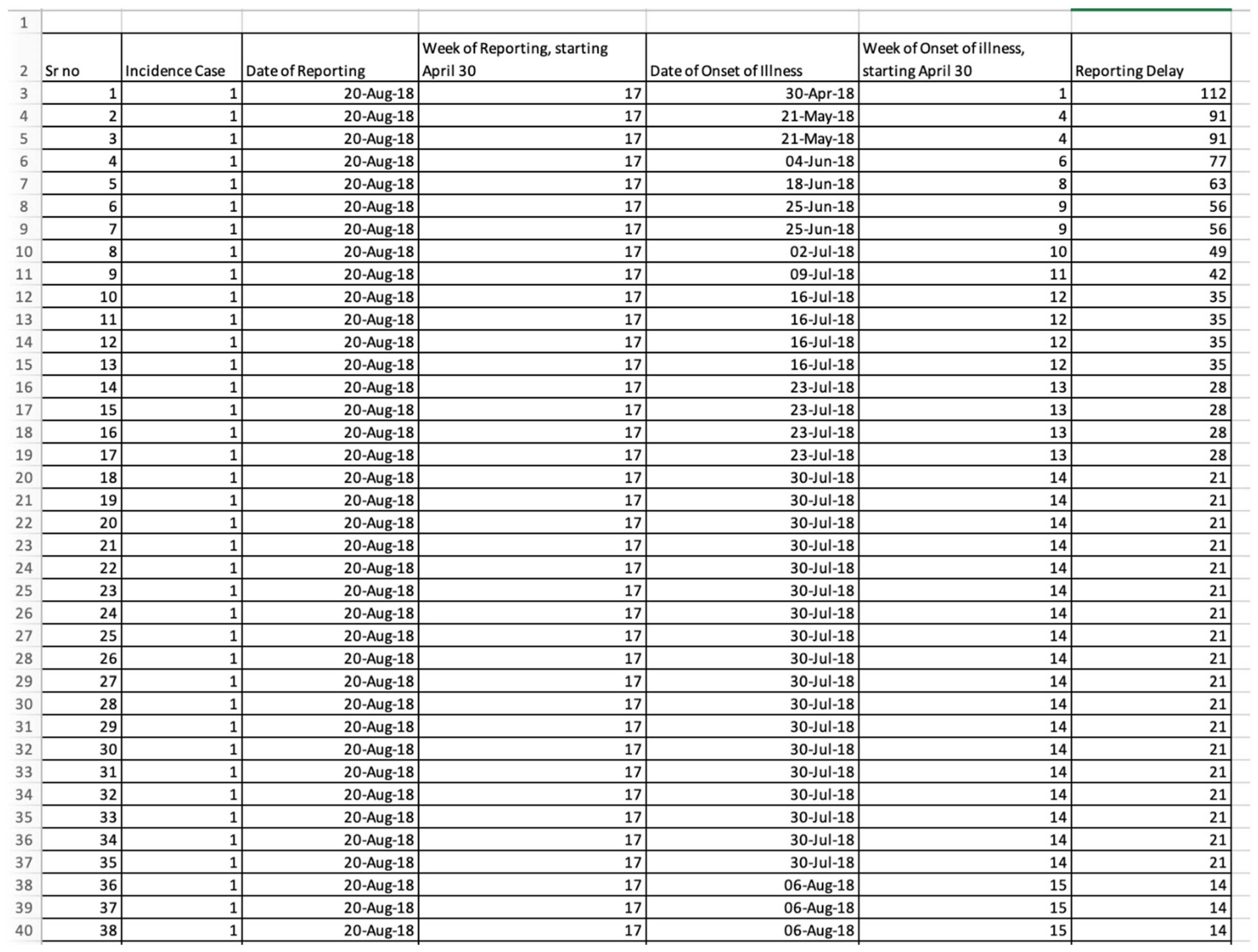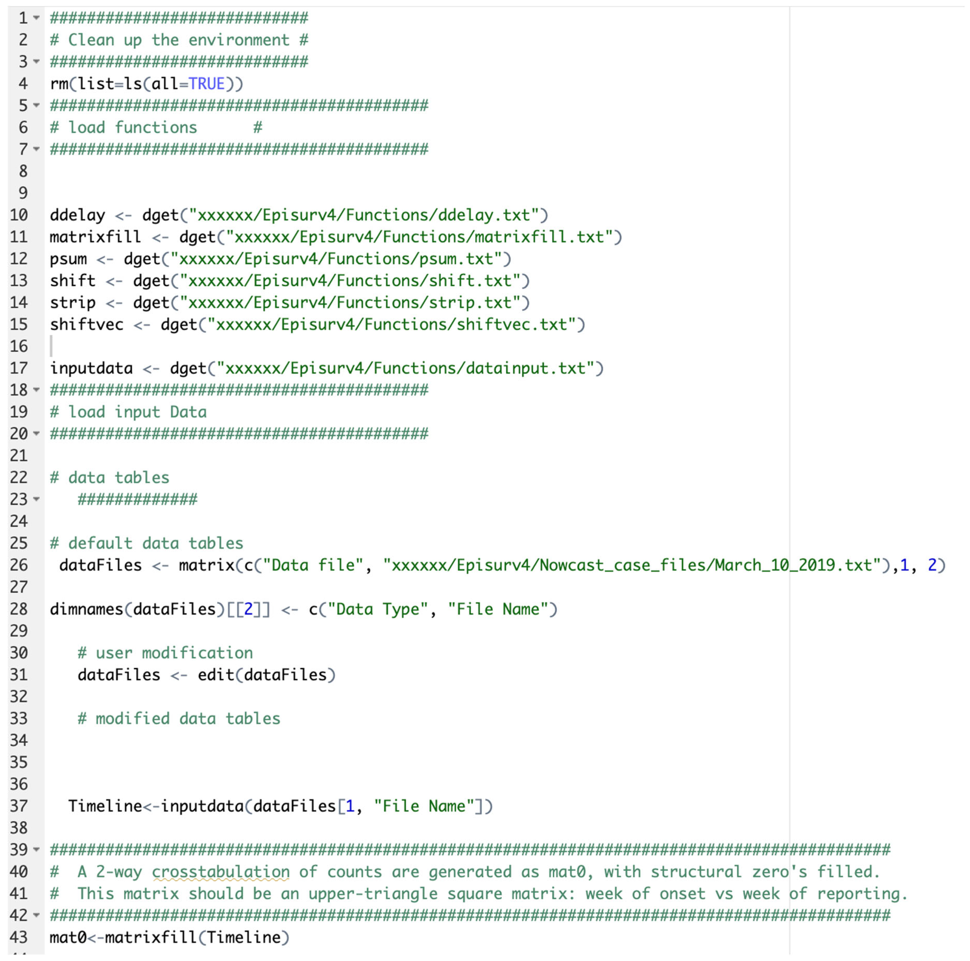 | ddelay.txt | User | Contains the algorithms of lawless based on reverse-time hazards and survival analysis. The input data is the matrix “mat”. There is a second choice, called “m”. This is to select the most recent “m” weeks (according to week of reporting) that we believe the reporting practice has been reasonably stable. |