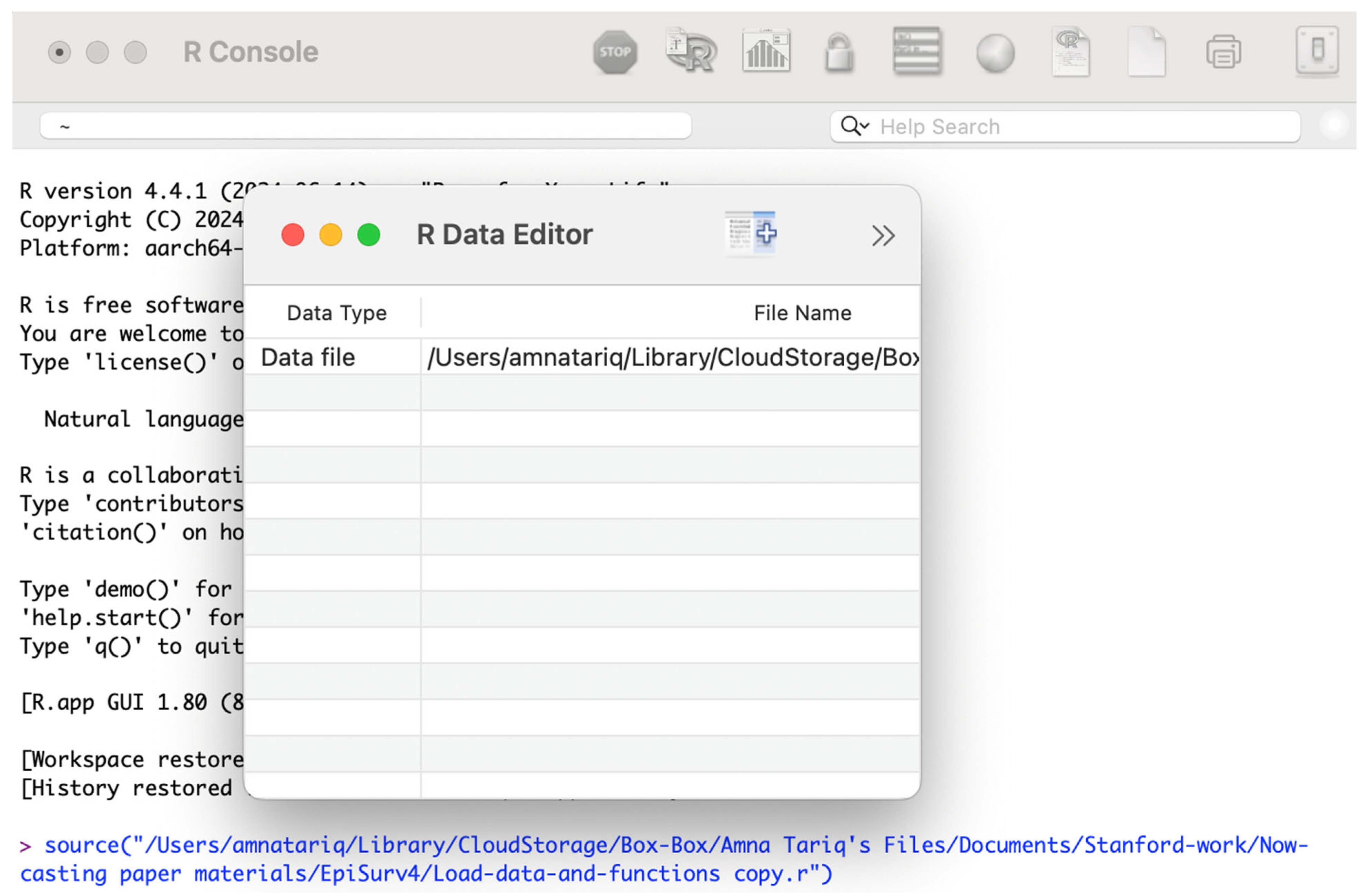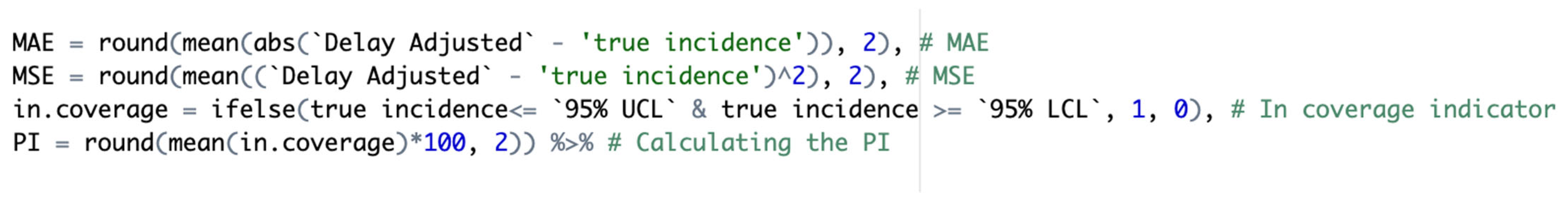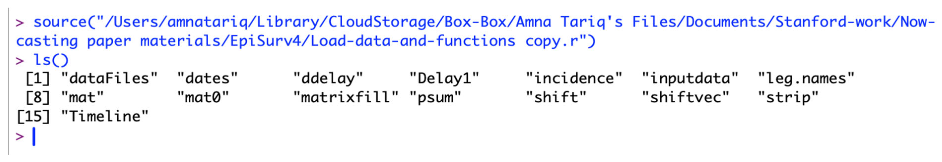 - Download the R code located in the ‘Reporting delay adjustment code’ folder from the online GitHub repository: https://github.com/atariq2891 (accessed on 8 August 2025).