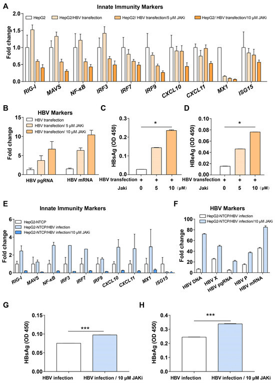 Inhibition of JAK-STAT pathway improved HBV replication. (A) Innate immunity markers in HepG2 cells, HepG2 cells transfected with HBV, HepG2 cells transfected with HBV and treated with JAKi (5 or 10 μM). (B) Expression of HBV markers in JAKi-treated or non-treated HepG2 cells transfected with HBV. (C) ELISA for HBsAg in JAKi-treated or untreated HepG2 cells transfected with HBV for 6 days. (D) ELISA for HBeAg in JAKi-treated or untreated HepG2 cells transfected with HBV for 6 days. (E) Innate immunity markers in HepG2-NTCP cells, HepG2-NTCP cells infected with HBV, and HepG2-NTCP cells infected with HBV and treated with JAKi (10 μM). (F) Expression of HBV markers in treated or untreated HepG2-NTCP cells infected with HBV. (G) ELISA for HBsAg in JAKi treated or untreated HepG2-NTCP cells infected with HBV for 10 days. (H) ELISA for HBeAg in JAKi-treated or untreated HepG2-NTCP cells infected with HBV for 10 days. * represents p < 0.05, *** represents p < 0.001.