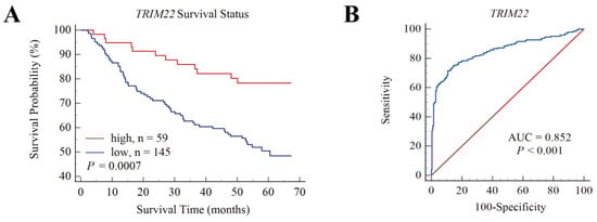 Overall survival (OS) and ROC of TRIM22 for HBV-associated HCC patients in GSE14520. (A). OS of TRIM22 shows survival rate of the high-TRIM22-expression group was higher than the low-TRIM22-expression group. (B). ROC of TRIM22, AUC = 0.852, p < 0.001.