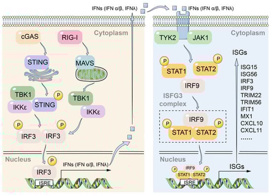 Innate immune responses triggered by the cellular intrinsic system such as PRRs that identify pathogen infection is essential for early clearance of hepatitis B virus infection. The cGAS-STING pathway is responsible for sensing viral DNA, while the RIG-I/MAVS pathway detects viral RNA. Upon activation, both pathways converge to phosphorylate the transcription factor IRF3 through the TBK1/IKKε kinases, thereby initiating the transcription and secretion of type I/III interferons. These interferons subsequently activate the JAK-STAT pathway, leading to the transcription of interferon-stimulated genes (ISGs) (Figure 7). In response to the host cell response, HBV has developed various strategies to evade the innate immune system to establish a chronic infection state in hepatocytes. Therefore, enhancing the intrinsic innate immune response of host cells may be an effective strategy for the development of new anti-HBV drugs, and several innate immunity activators such as Toll-like receptor and RIG-I agonist are being tested in clinical trials [56,57].