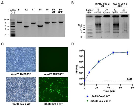 Unpurified SARS-CoV-2 GFP DNA assembly and N plasmid were electroporated into HEK293T and HEK293T ACE2 cells. Briefly, 1 × 106 HEK293T or HEK293T ACE2 cells were resuspended in cold Opti-MEM (Gibco, Thermo Fisher Scientific, Waltham, MA, USA) completed with ATP (Thermo Fisher Scientific, Waltham, MA, USA) and glutathione (Sigma-Aldrich, St. Louis, MO, USA). Then, the cell suspension was mixed with 50 µL of SARS-CoV-2 GFP DNA assembly and 200 ng of N plasmid. The mixture was transferred into a 4 mm electroporation cuvette (Bio-Rad Laboratories, Hercules, CA, USA) and placed into the Gene Pulser Xcell electroporation system (Bio-Rad Laboratories, Hercules, CA, USA). A single electrical pulse with settings of 270 V at 950 μF was performed. Next, the mixture was incubated for 5 min at RT and later transferred into a Falcon tube containing 1.5 mL Dulbecco′s Modified Eagle Medium DMEM (Gibco, Thermo Fisher Scientific, Waltham, MA, USA) with 10% fetal bovine serum (Sigma-Aldrich, St. Louis, MO, USA) and 100 U/mL of penicillin-streptomycin (Gibco, Thermo Fisher Scientific, Waltham, MA, USA). Cells were incubated under 5% CO2 and 37 °C conditions. After 24 h, cells were trypsinized and seeded over a monolayer of 5 × 105 Vero E6 TMPRSS2 cells. Cells were incubated under 5% CO2 and 37 °C conditions and observation for GFP expression was performed every 24 h for 10 days.