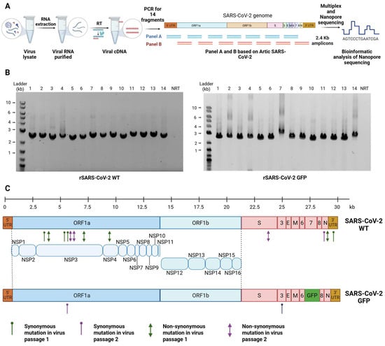 Sequencing of rSARS-CoV-2. (A) Oxford Nanopore DNA sequencing workflow for rSARS-CoV-2. (B) DNA fragments of SARS-CoV-2 for Nanopore sequencing. An amount of 14 amplicons of 2.4 kb covering the full genome of rSARS-CoV-2 WT (left panel) and rSARS-CoV-2 GFP (right panel) were generated by RT-PCR of RNA extracted from supernatant of Vero E6 TMPRSS2 cells at 72 hpi. (C) Schematic representation of rSARS-CoV-2 WT and rSARS-CoV-2 GFP genome. Synonymous (hairpins) and non-synonymous (arrows) mutations of each virus are indicated, specifying those mutations present in two different passages (passage 1 = green and passage 2 = purple).
