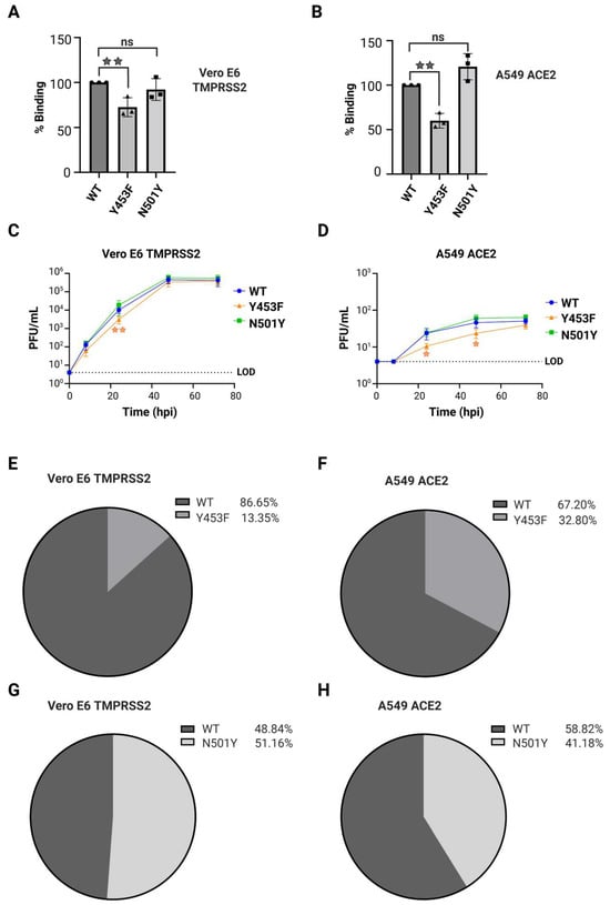 Competition assay was performed infecting a monolayer of 5 × 105 Vero E6 TMPRSS2 or A549 ACE2 cells with 5 different virus combinations at a MOI 0.1 PFU/cell: (1) rSARS-CoV-2 WT, (2) rSARS-CoV-2 Y453F, (3) rSARS-CoV-2 N501Y, (4) rSARS-CoV-2 WT plus rSARS-CoV-2 Y453F or 5) rSARS-CoV-2 WT plus rSARS-CoV-2 N501Y for 1 h at 4 °C with gently shake every 10 min. After, the inoculum was removed, fresh DMEM supplemented with 5% FCS, 100 U/mL of penicillin–streptomycin was added to the cells. Cells were incubated under 5% CO2 and 37 °C conditions.
