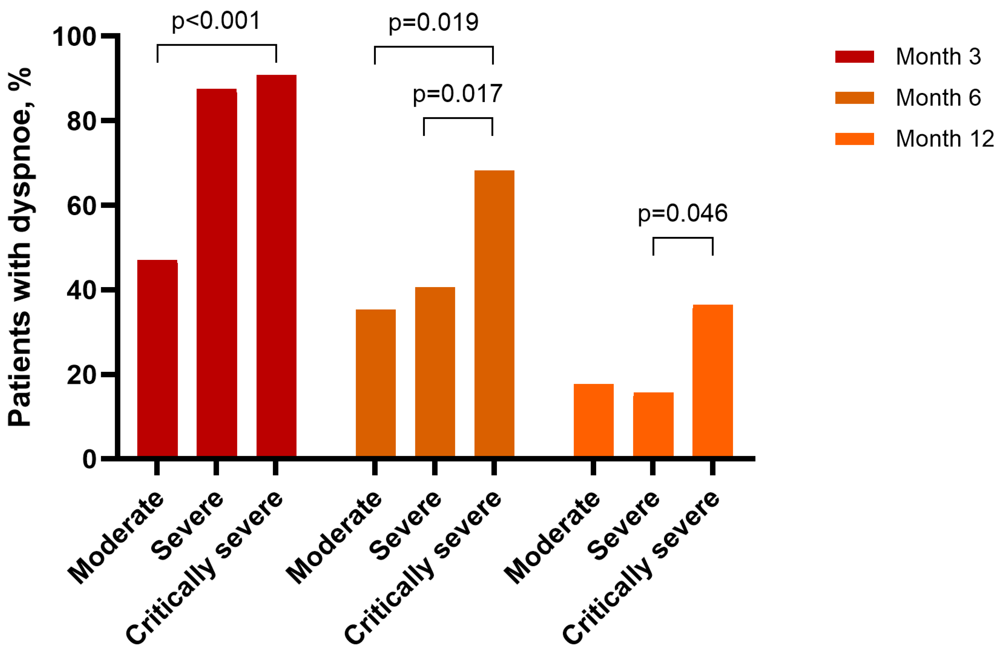 Figure 1. Prevalence of dyspnea at 3, 6, and 12 months after discharge, stratified by initial COVID-19 severity. The figure displays changes in dyspnea prevalence over time in patients with moderate, severe, and critical illness.