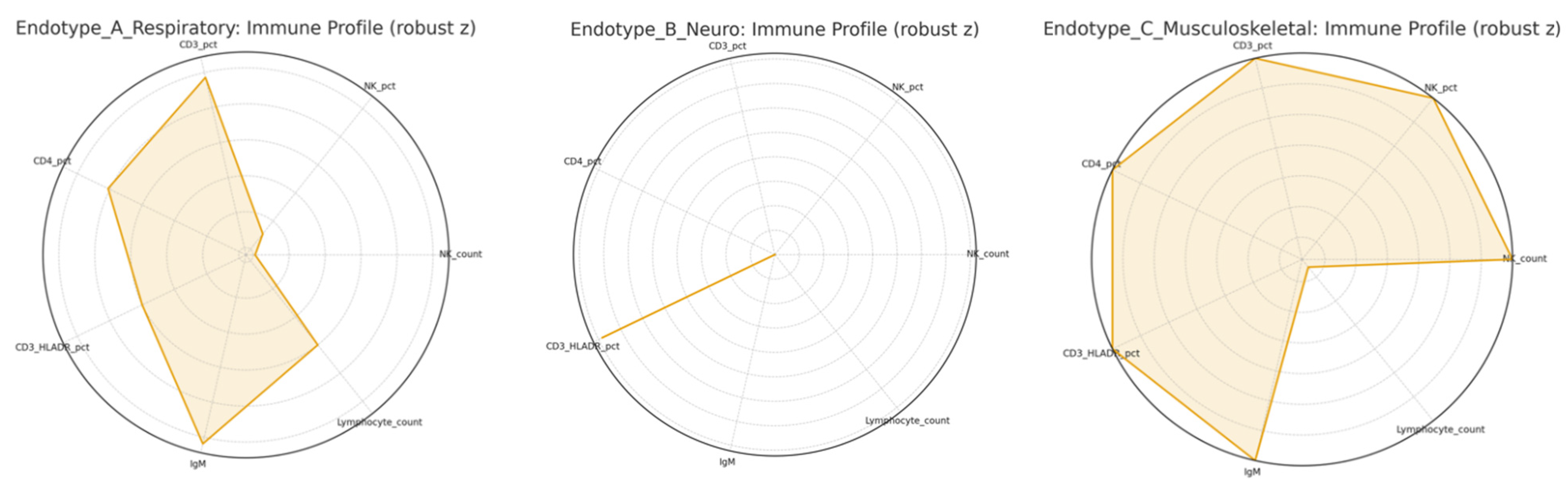 Figure 3. (exploratory). Radar plots of immune profiles per endotype. For each endotype (Respiratory, Neurocognitive, Musculoskeletal), spokes display the immune markers using the robust standardized differences; 0 indicates no difference vs. asymptomatic at the same timepoint.