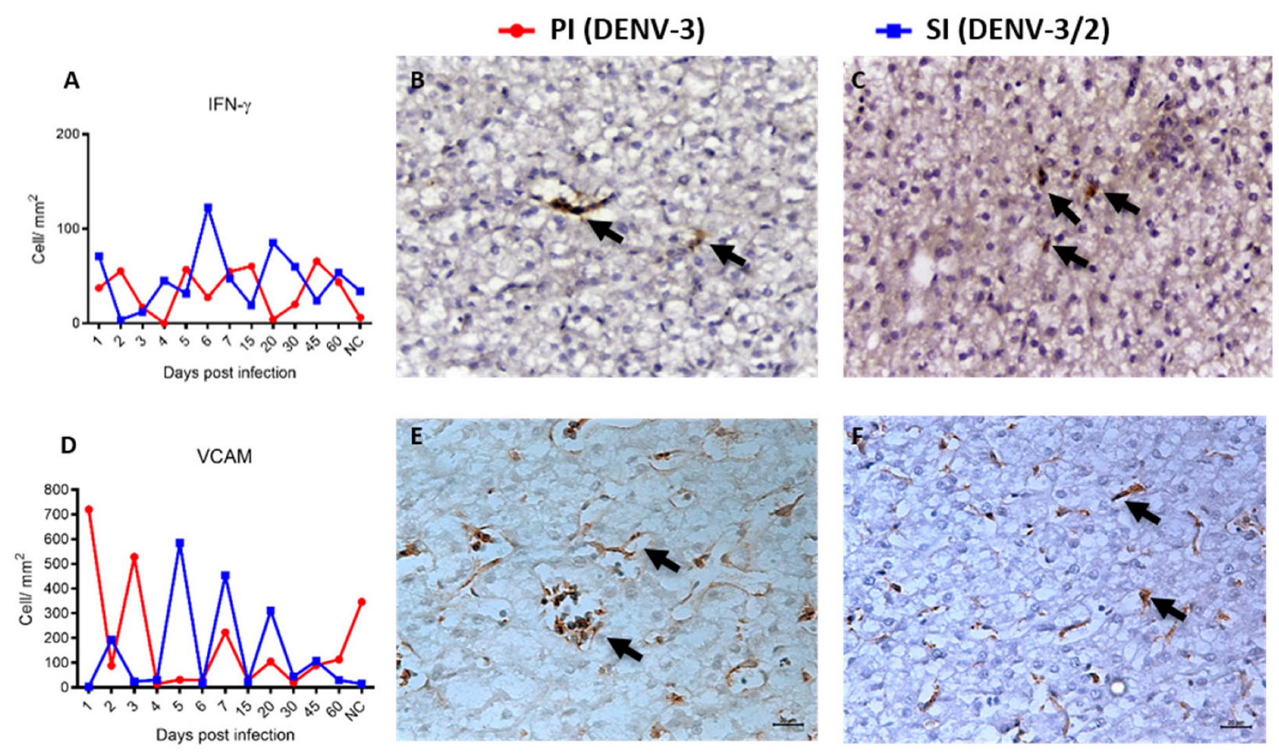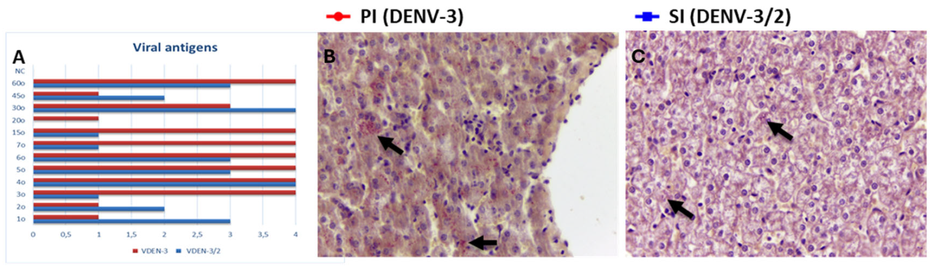 - Pagliari, C.; Quaresma, J.A.S.; Fernandes, E.R.; Stegun, F.W.; Brasil, R.A.; de Andrade, H.F.; Barros, V.; Vasconcelos, P.F.C.; Duarte, M.I.S. Immunopathogenesis of dengue hemorrhagic fever: Contribution to the study of human liver lesions. J. Med. Virol. 2013, 86, 1193–1197. [Google Scholar] [CrossRef]
