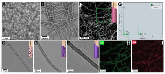 TMVFs were obtained using a TMV variant with cysteine mutations at the 103rd, 53rd, and 74th residues, as recently reported by Wang’s group [24]. The introduced cysteines form disulfide (S–S) covalent bonds, which induce the TMV subunits to assemble into ultralong hollow protein fibers with excellent structural stability. Transmission electron microscopy (TEM) clearly revealed the highly efficient assembly of TMVFs after just one day of incubation in phosphate buffer (Figure 1A,B). These assembled TMVFs exhibited desirable thermostability, maintaining structural integrity without any breakage after incubation in water at 70 °C (Figure S1). More importantly, the abundant ctableharged groups on their external surfaces facilitate metal ion deposition [26,27]. Specifically, Pd2+ or Pt2+ ions spontaneously nucleated and grew into small NPs on the surface of TMVFs after 1 h of co-incubation at 70 °C. The density of the NPs could be controlled by concentration or by tuning the reaction time (Figure 1C,D and Figure S2). Notably, Pd2+ or Pt2+ ions have a different nucleation and growth rate on the TMVF. 0.2 mM Pt2+ ions would nucleate and grow into 2~3 nm NPs (Figure S2A). The density of NP would increase with the increasing Pt2+ in the reaction system (Figure S2B). Compared with the Pt2+ ion, Pd2+ undergoes quicker nucleation and growth. We could find that dense Pd NPs form on the TMVF even in a low reaction concentration of 0.2 mM Pd2+ (Figure S2C). When Pd2+ increases in the reaction system, the TMVF would be coated by a thick Pd shell with a thickness of several nanometers (Figure S2D). In addition, bimetallic Pt/Pd NWs were successfully obtained through simple co-growth (Figure 1F and Figure S2E). Energy-dispersive spectroscopy (EDS) mapping revealed that the resulting NWs consisted of Pt and Pd elements with uniform distribution (Figure 1G–I).