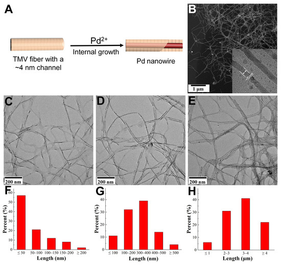 In addition to the external surface of TMVFs, the inner channel also served as another desirable reactive site for the confined mineralization of novel metals [28]. Although earlier studies have reported the mineralization of metal nanochains or NWs in the channels of TMV nanorods, their yields were limited by the structural instability of native TMV templates [29,30,31]. In contrast, our robust TMVFs significantly improved the synthetic efficiency of Pd NWs within their inner channels (Figure 2A,B). In detail, Pd2+ ions were mixed with TMVFs and polyvinylpyrrolidone (PVP30K) and then reduced by ascorbic acid under magnetic stirring. PVP30K has been shown to enhance Pd nucleation in the inner channel of TMV fiber. TEM images revealed that numerous short Pd nanorods rapidly formed in the cavities of TMVFs (Figure 2C,F). The growth of the Pd nanorods was strongly influenced by the reaction temperature. When the temperature increased from 25 °C to 37 °C, the length of the Pd NWs remarkably increased from tens of nanometers to several hundred nanometers (Figure 2D,G). It is worth noting that Pd growth did not cause any breakage of the TMVF template. Therefore, a cyclic growth strategy was adopted to achieve high-quality NWs. After two cycles of growth at 37 °C, most of the Pd NWs reached several micrometers in length (Figure 2E,H). The confined channels ensured that the Pd NWs consistently maintained a diameter of approximately 5 nm, even as their length increased from several nanometers to several micrometers. The yield and quality of the resulting Pd NWs were greatly improved compared with previously reported TMV-based mineralization systems, which can be attributed to the excellent structural stability of the TMVFs. However, no similar NW formation was observed in the TMV channels when using other metal ions such as Pt2+ or Ag+, which instead randomly formed nanoparticles in solution (Figure S3). We speculated that the reduction potential of Pd2+, Pt2+ and Ag+ is the key factor in determining the nucleation and growth in the channel or in the solution. Moreover, the pH value, temperature, and reducing agent also affect the procedure. In general, Pd2+ is more easily nucleated in the channel of TMV than other metal ions based on this synthetic method.