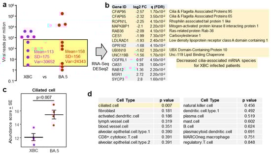 To mitigate against the influence of large viral RPM differences, patient samples with comparable viral RPM were used for human gene expression analysis (Figure 3a, yellow shaded box). The exclusion of samples with high (>1000) and very low (1 and 2.3) viral RPM, left four XBC and four BA.5 samples, with comparable means, standard deviations, and variances (Figure 3a). These eight samples had slightly higher RIN scores (range 3.8–7.8, mean 5.6 ± SD 1.2). DeSeq2 again only identified a small number of DEGs; however, 9/10 of the mRNA species that were down-regulated in XBC samples were associated with cilia (Figure 3b). This analysis argues that more ciliated epithelial cells were infected and disrupted in the nasopharynx of XBC-infected patients than in BA.5-infected patients. The genes were the cilia-associated protein CFAP95 [56] and CFAP65 (expressed in lung [57]), ROPN1L [58], MAPK8IP1 [59], RAB36 (paralog of RAB34) [60], CES1 (highly expressed in ciliated epithelium [61]), LDLRAD1 [62], UBXN10 [63], and UNC119 [64].