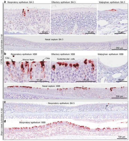 C57BL/6J and Ifnar-/- mice were infected with BA.5 and XBB as in Figure 4b, and whole heads were fixed and embedded in paraffin. For orientation, an example of a whole head section stained by H&E is shown in Figure S2c. To show virus infected cells, such sections were stained by immunohistochemistry (IHC) using an anti-SARS-CoV-2 spike protein monoclonal antibody [39]. For C57BL/6J mice, staining was much less abundant after BA.5 infection (Figure 5a) than after XBB infection (Figure 5b), consistent with the viral titration data shown in Figure 4b. In the nasal turbinates, epithelial cells of the respiratory epithelium, olfactory epithelium, and Malpighian epithelium stained positive (Figure 5a,b). An enlargement of the image showing cilia staining (Figure 5b) is shown in Figure S2d, and clearly illustrates the staining of ciliated epithelial cells and their cilia, which protruding into and across the mucus layer [67]. IHC of lung tissue is shown in Figure S2e, illustrating similar levels of staining for both viruses, consistent with the viral titration data in Figure S2a.