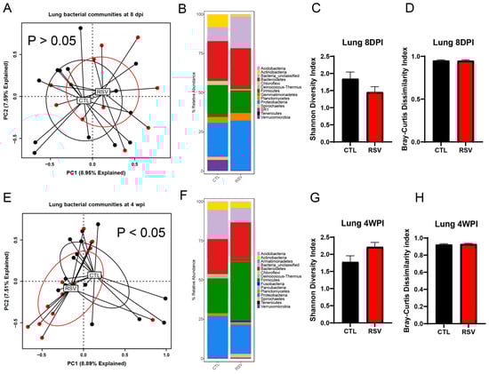 To explore corresponding changes of lung microbiome following early-life RSV infection, the bacterial communities of the lung samples were profiled using 16S rRNA gene sequencing at 8 days and 4 weeks post-RSV infection. While the overall bacterial composition of the lung was not significantly different between RSV-infected mice and uninfected mice (CTL group) at 8 days post-RSV infection (Figure 2A, p = 0.582, PERMANOVA), that of RSV-infected mice at 4 weeks post-RSV infection was significantly different from that of uninfected mice (CTL group) (Figure 2E, p < 0.05, PERMANOVA). The variance in the PC1 and PC2 analysis covers 16%, suggesting that infection was not the sole influence on samples. RSV exposure did not significantly affect Shannon diversity or Bray–Curtis dissimilarity indices in lung tissue. Median α-diversity and within-group dispersion were comparable to controls at both 8 dpi and 4 wpi (p > 0.05 for all comparisons). Lung bacterial communities in both groups were dominated by Proteobacteria, Firmicutes, Actinobacteria and Bacteroidetes. RSV infection produced a small, non-significant enrichment of Proteobacteria with a reciprocal reduction in Firmicutes at 8 dpi; these differences had largely resolved by 4 wpi with increased Firmicutes and a reduction in Proteobacteria. Thus, in the lung, a transient and subtle alteration was observed in RSV-infected mice.
