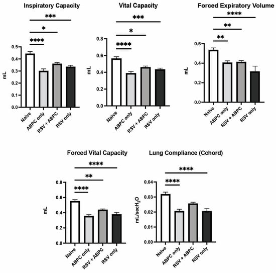 Lung physiology deterioration is induced by both RSV and ampicillin. Neonatal mice infected with RSV at 7 days of age and/or ampicillin (ABPC; 100 mg/kg/day) from day 14–21 of age were assessed for pulmonary function tests at 5 weeks of age (4 weeks post-infection). The altered PFT parameters were assessed in anesthetized mice as described in Materials and Methods. Data represent mean ± SEM of 6–12 mice/group. * p < 0.05, ** p < 0.01, *** p < 0.001, **** p < 0.0001.