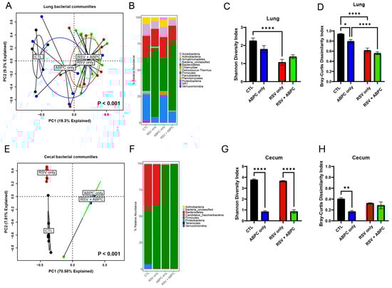 The lung and gut microbiomes are altered by ampicillin with or without RSV infection. The left lungs and cecum from uninfected mice, ampicillin-treated (ABPC; 100 mg/kg/day), and RSV-infected mice were harvested at 4 weeks post-RSV infection and processed for 16S rRNA sequencing. The bacterial communities were compared by principal component analysis and PERMANOVA analyses to determine if there were differences in the bacterial communities of the lung and cecum at 8 days (A) and 4 weeks post-RSV infection (E). The bacterial communities in the lungs were also compared by the stacked abundance plots of bacterial phyla at 4 weeks post-RSV infection (B). The bacterial communities in the cecum were also compared by the stacked abundance plots of bacterial phyla (F). The bacterial communities in the lungs (C,D) and cecum (G,H) were further evaluated within group by Shannon Diversity and Bray–Curtis Dissimilarity Indices. Data represent mean ± SEM of 6–12 mice/group. * p < 0.05, ** p < 0.01, **** p < 0.0001.