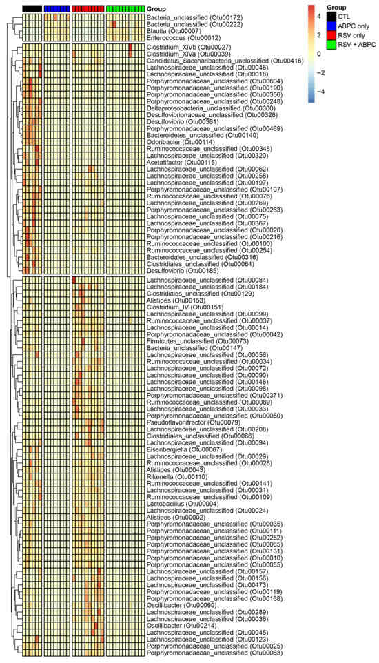 Differentially altered bacteria OTUs in EL-RSV with and without ampicillin treatment. Significantly altered OTUs in the cecal microbiome between treatment groups. OTUs are identified to a family taxonomic level. Values within the heat map represent the fold difference in OTU relative abundance between groups.