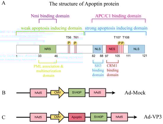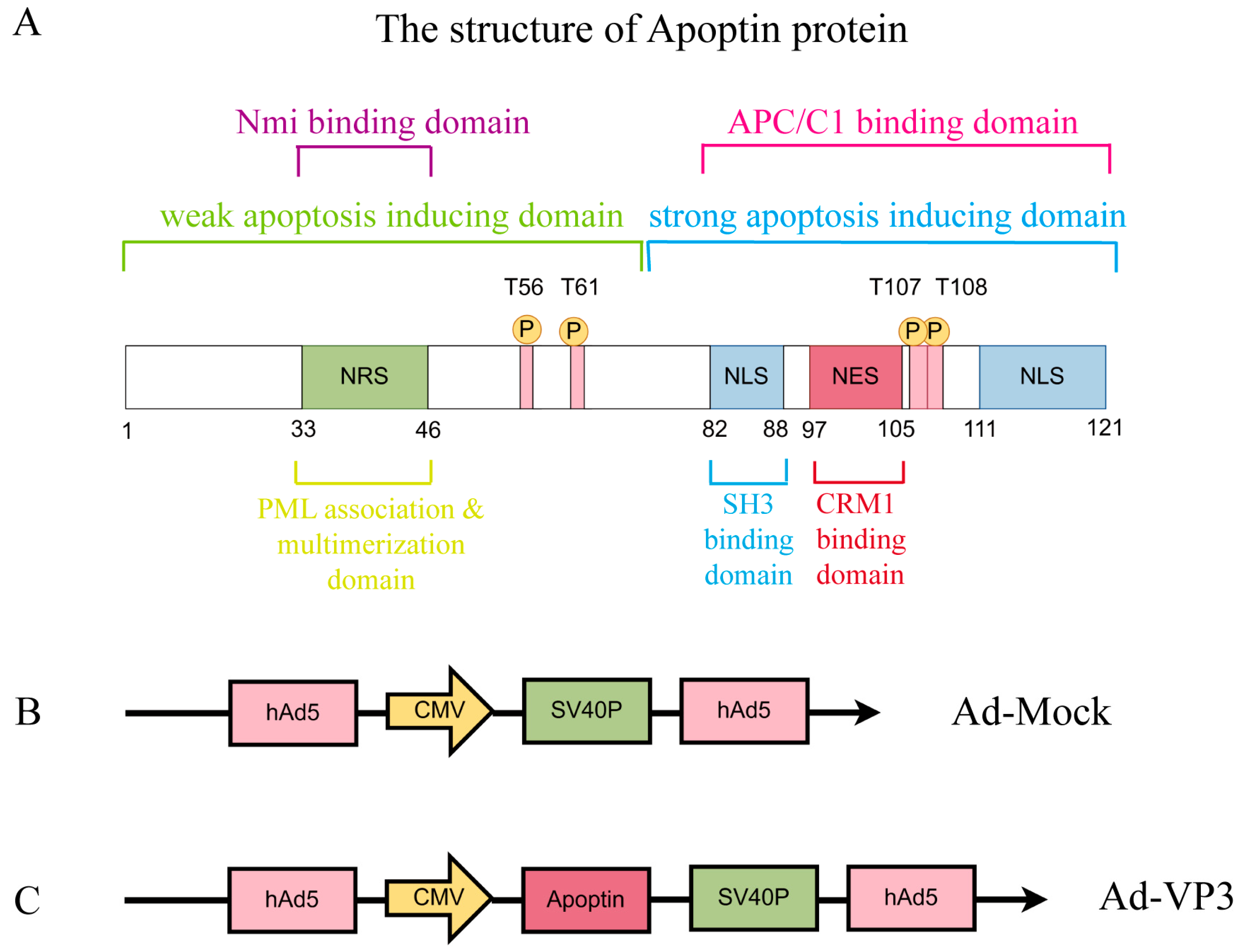 Diagram of Apoptin Protein Structure and the Two Recombinant Adenovirus Vectors Constructed in Our Laboratory Using Shuttle Vectors. These domains work synergistically to perform its function. (A) The structure of Apoptin: The C-terminal domain (amino acids 74–121) contains a bifunctional nuclear localization signal (NLS), a nuclear export signal (NES), and a tumor-specific phosphorylation site at T108. The NLS consists of two basic regions (NLS1: residues 82–88, NLS2: residues 111–121), ensuring efficient nuclear localization. The NES, located at residues 97–105, is recognized by CRM1 in normal cells, promoting cytoplasmic export. However, phosphorylation of T108 inhibits the NES function, enhancing nuclear accumulation. The N-terminal domain (amino acids 1–73) contains a polymerization center (residues 29–69) and a nuclear retention signal (NRS, residues 33–46). The polymerization center mediates monomer aggregation through a β-hairpin structure, while the NRS cooperates with the NLS to maintain nuclear retention. Additionally, the N-terminal region (residues 1–28) may prevent nuclear localization in normal cells by interacting with cytoplasmic proteins. (B) Ad-MOCK, (C) Ad-Apoptin (Ad-VP3).
