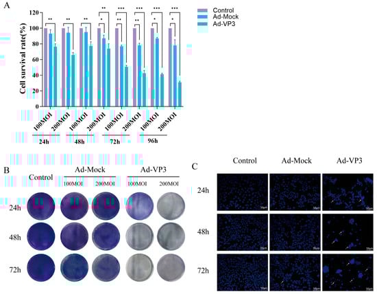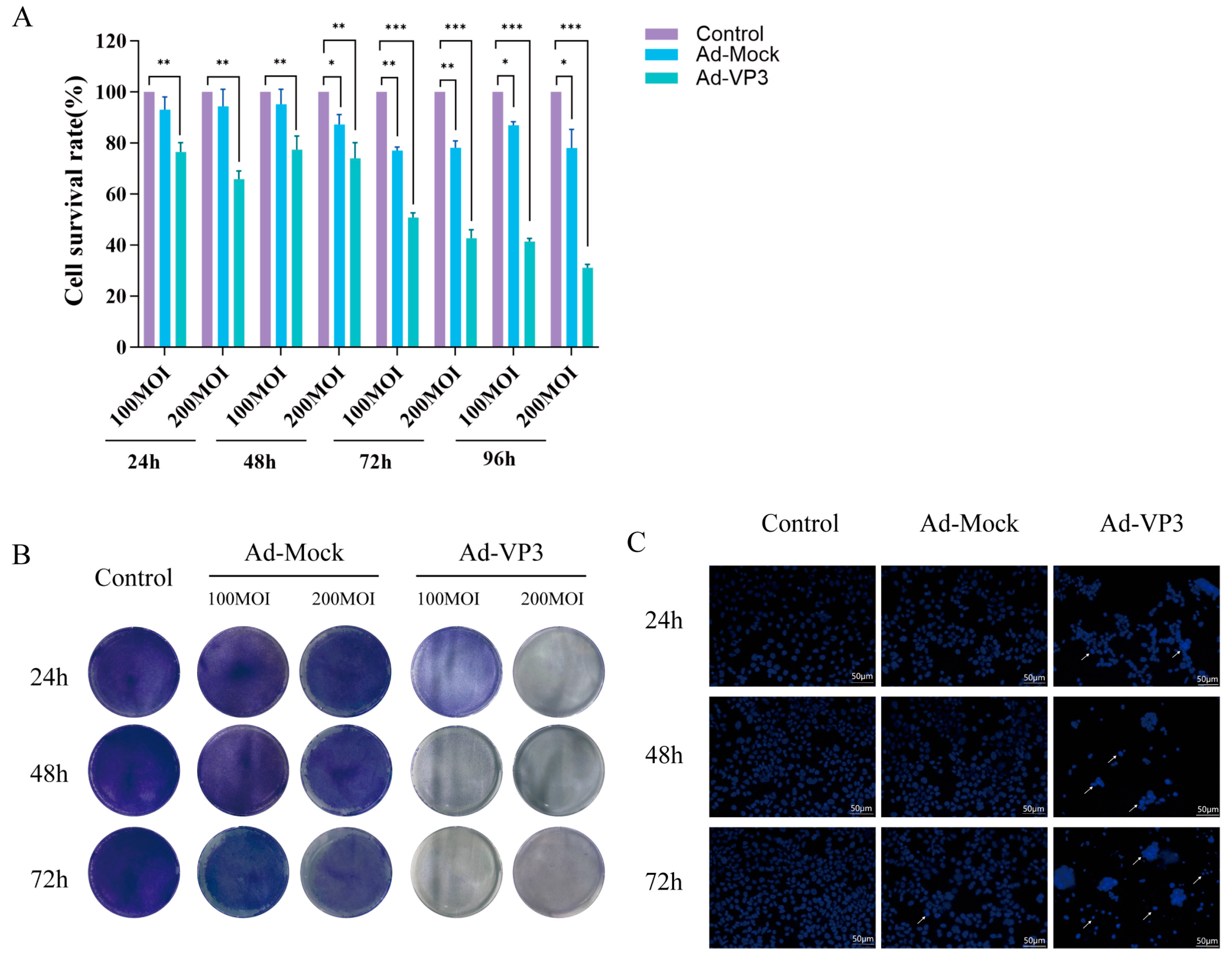 Cytotoxic and growth-inhibitory effects of Ad-VP3 on Hep3B cells. (A) CCK-8 assay results showing time- and dose-dependent cytotoxicity of Ad-VP3 at 24, 48, 72, and 96 h post-infection. (B) Crystal violet staining of Hep3B cells infected with Ad-VP3 or Ad-Mock at MOIs of 100, or 200, followed by staining at 24, 48, and 72 h. (C) Hoechst 33342 staining reveals apoptotic nuclear morphology following treatment with 100 MOI of Ad-VP3. White arrows indicate nuclear condensation and fragmentation revealed by Hoechst 33342 staining, characteristic of apoptotic cells.Data are mean ± SD (* p < 0.05, ** p < 0.01, *** p < 0.001).