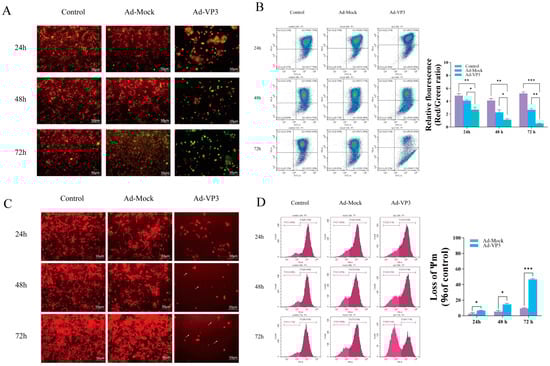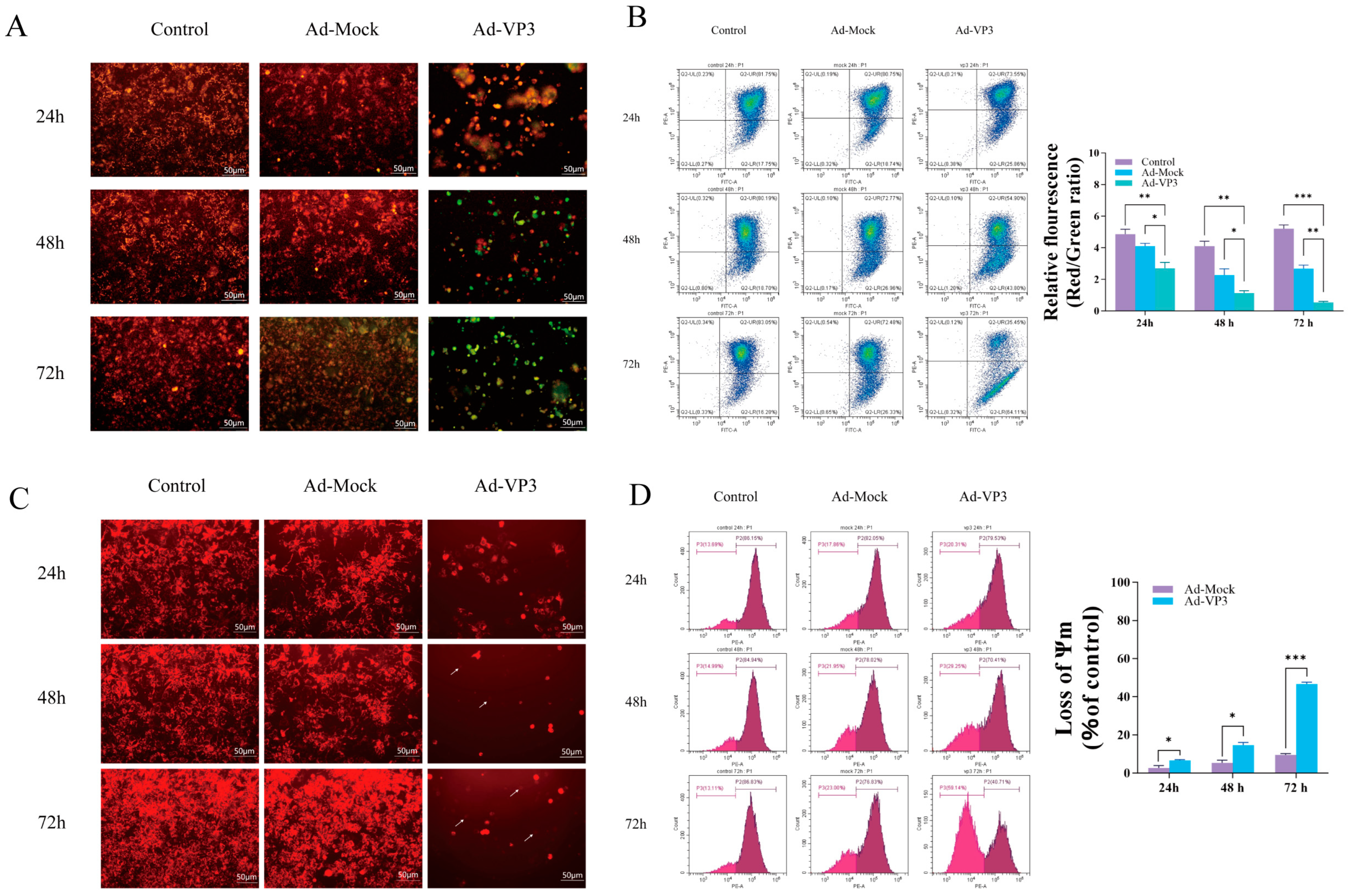 JC-1 dye (purchased from Life Technologies, Carlsbad, CA, USA) was used to assess both qualitative and quantitative changes in mitochondrial membrane potential (MMP). Hep3B cells were collected and seeded in 6-well plates at a density of 3.5 × 105 cells per well in 2 mL medium and incubated at 37 °C with 5% CO2 for 24 h. Subsequently, Ad-VP3 and Ad-Mock were added at a multiplicity of infection (MOI) of 100 (3.5 × 107 PFU). At 24, 48, and 72 h post-infection, one 6-well plate from each group was collected, and cells were dissociated into a single-cell suspension. The cells were then incubated with 1 mL of JC-1 dye diluted at a 1:5000 ratio (0.2 μL JC-1 dye and 1 mL culture medium) and incubated in the dark at 37 °C for 15 min. After incubation, the cell slides were inverted and observed under a fluorescence microscope. Following this treatment, the cell samples were transferred to flow cytometry tubes and analyzed using a flow cytometer.