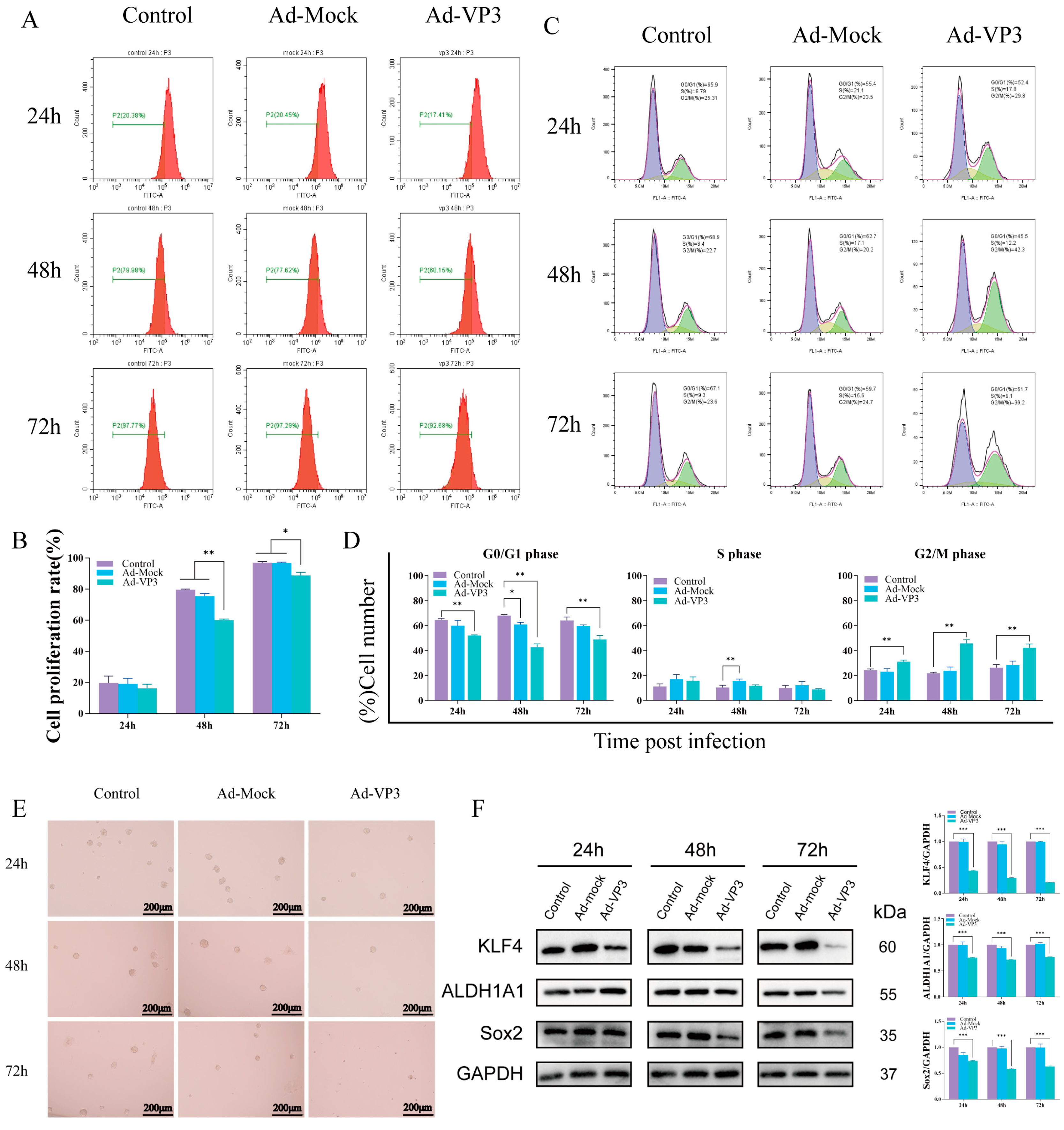 To assess the impact of recombinant adenovirus Ad-VP3 on the proliferation of Hep3B cells, we conducted a CFSE staining assay followed by flow cytometry analysis (Figure 3A,B). CFSE is a fluorescent dye that can penetrate cell membranes and enter cells, where it is hydrolyzed by intracellular esterases. The hydrolyzed CFSE molecules react with free amino groups in intracellular cytoskeletal proteins, ultimately forming fluorescent protein adducts. In flow cytometry detection, CFSE bound to the cytoskeleton emits green fluorescence upon excitation. As the parent cells divide, the fluorescent marker is equally distributed to the daughter cells, resulting in a logarithmic decay of fluorescence intensity. This allows for precise quantification of cell proliferation and division. The CFSE results showed that the fluorescence decay rate in the Ad-VP3-treated group at both 48 and 72 h was significantly lower than that in the control group (p < 0.05), indicating a marked inhibition of cell division. In contrast, there was no significant difference in the fluorescence decay curves between the Ad-Mock and control groups, suggesting that Ad-VP3 effectively inhibits Hep3B cell proliferation. Cell cycle analysis revealed that treatment with recombinant adenovirus Ad-VP3 induced a G2/M phase arrest in Hep3B cells, thereby inhibiting the proliferation of liver cancer cells (Figure 3C,D). Tumorsphere formation assays demonstrated that, under serum-free conditions for one week, Hep3B cells treated with Ad-VP3 formed fewer and smaller tumorspheres compared to the control or Ad-Mock groups (Figure 3E). Western blot analysis indicated that Ad-VP3 may inhibit the stemness of Hep3B cells by downregulating the expression levels of stemness-related proteins such as ALDH1A1, KLF4, and Sox2 (Figure 3F).