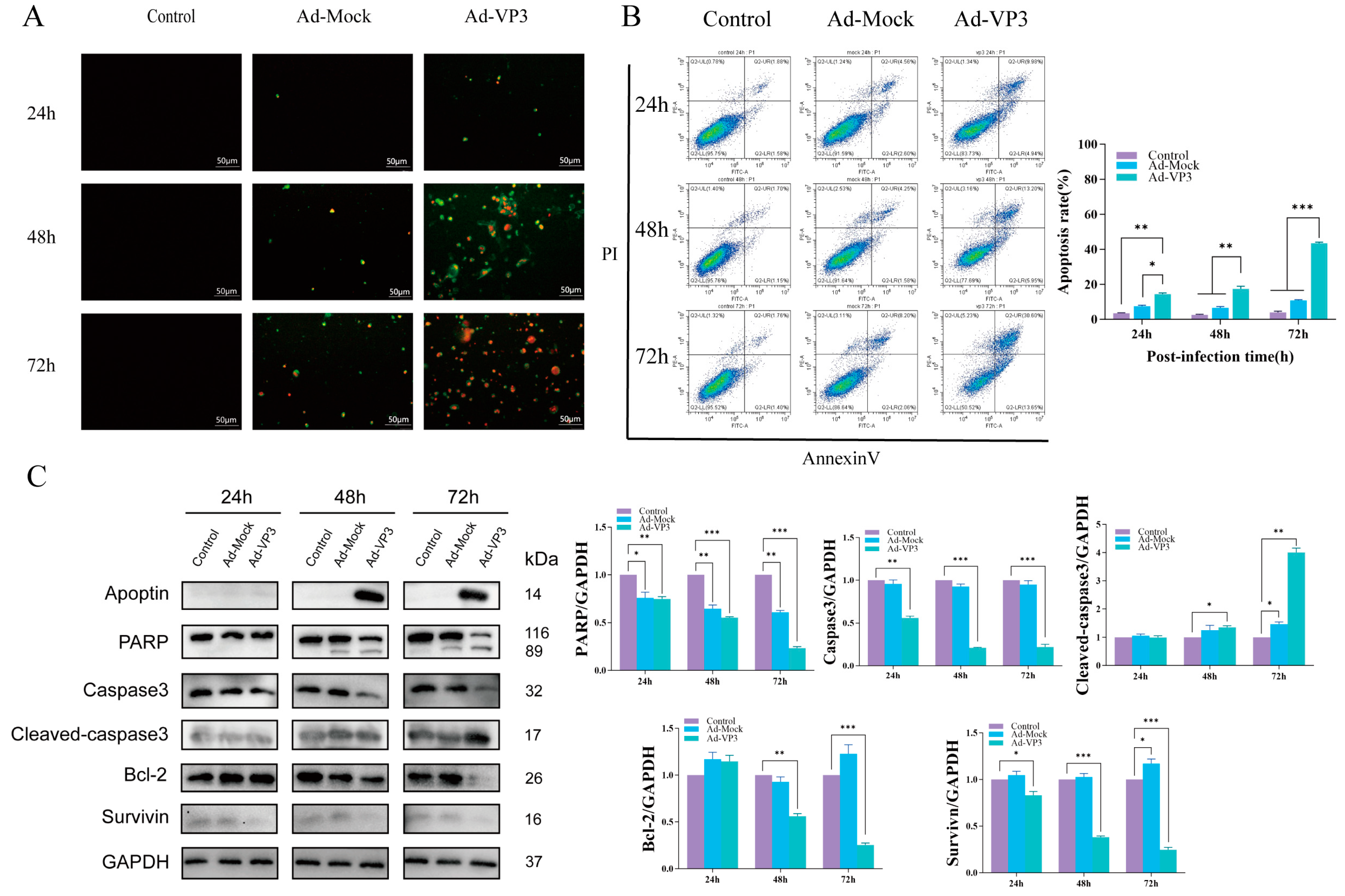 To determine whether the recombinant adenovirus induces hepatocellular carcinoma cell death via apoptosis, we first evaluated apoptosis levels using Annexin V-FITC/PI staining (Figure 4A,B). During apoptosis, early and late apoptotic cells expose phosphatidylserine on the outer leaflet of the plasma membrane, which binds Annexin V in the Annexin V-FITC/PI kit and emits green fluorescence, while late apoptotic or necrotic cells take up PI and emit red fluorescence. Annexin V-FITC/PI staining showed that apoptotic cells exhibiting green and red fluorescence could already be observed in the recombinant adenovirus group at 24 h post-infection. At 48–72 h, the intensity and proportion of green and red fluorescent cells further increased, indicating a marked elevation in the apoptotic cell population (Figure 4A). Flow cytometry analysis revealed that the proportion of apoptotic cells increased progressively over time, with apoptosis rates in the Ad-VP3 group reaching approximately 15%, 19%, and 44% at 24, 48, and 72 h, respectively (Figure 4B). Western blot analysis confirmed Apoptin expression in the Ad-VP3 group. Notably, Apoptin protein was not detected at 24 h, although flow cytometry still showed a relatively high apoptosis rate in the Ad-VP3 group. This may be due to Apoptin expression interfering with cellular metabolism at the transcriptional or translational level, and/or a direct cytotoxic effect of adenoviral infection itself, both of which could trigger early apoptotic signaling. In the Ad-VP3-treated group, the expression level of cleaved caspase-3 was markedly upregulated, accompanied by cleavage of its substrate PARP. At the same time, Ad-VP3 significantly downregulated the expression of pro-caspase-3 and the anti-apoptotic proteins Bcl-2 and Survivin (Figure 4C). Together, these findings indicate that Ad-VP3 exerts a pronounced, time-dependent pro-apoptotic effect on Hep3B cells.
