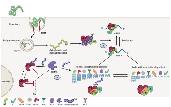 - Galao, R.P.; Wilson, H.; Schierhorn, K.L.; Debeljak, F.; Bodmer, B.S.; Goldhill, D.; Hoenen, T.; Wilson, S.J.; Swanson, C.M.; Neil, S.J.D. TRIM25 and ZAP target the Ebola virus ribonucleoprotein complex to mediate interferon-induced restriction. PLoS Pathog. 2022, 18, e1010530. [Google Scholar] [CrossRef]