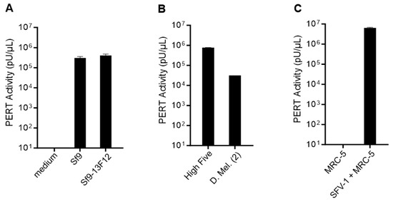 The Sf9 cell line can be cultured adherent or in suspension, with or without a serum. In this study, the cells were grown as an adherent culture with a serum. The presence of RT activity in cell-free supernatant of Sf9 cells was evaluated using the highly sensitive PERT assay. The results shown in Figure 1A indicated that a similar RT activity (about 105 to 106 pU/µL) was produced by Sf9 cells, which are infected with the Sf-rhabdovirus, and Sf9-13F12 cells, which are Sf-rhabdovirus-free cells [25,28]. No RT activity was detected in the complete medium. A similar level of RT activity was also detected in the cell free supernatant from insect High Five cells and a lower level (about 104 to 105 pU/µL) was detected from D. Mel. (2) cells (Figure 1B). A high level of RT activity (about 106 to 107 pU/µL) was detected in the cell-free supernatant of SFV-1 infected MRC-5 cells, which represented a positive retrovirus control for the PERT assay. No RT activity was detected from the uninfected MRC-5 cells (Figure 1C).