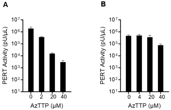 PERT analysis of AzTTP inhibition of retroviral RT activity. AzTTP was added at final concentrations of 0, 2 or 4, 20, and 40 µM in the RT step of the PERT assay. (A) HIV-1 RT enzyme; and (B) Sf9 RT in filtered supernatant.
